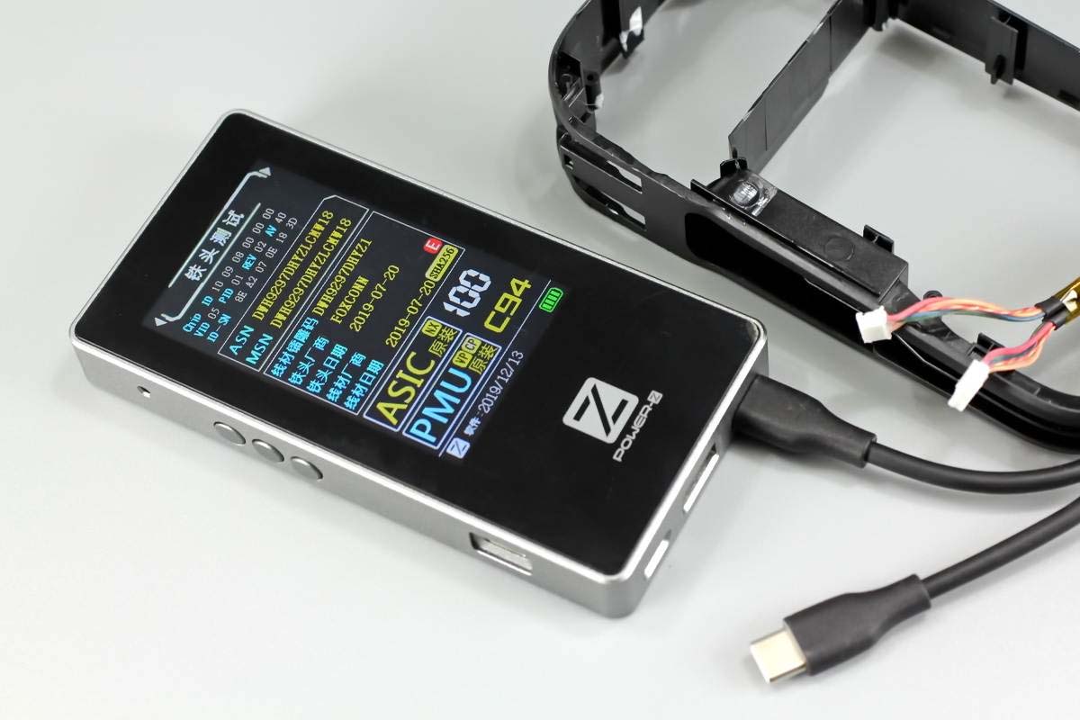 最后使用MF001測試儀對Lightning線的端子進行測試,測得ASIC、PMU均為原裝C94元件,評分為100分,生產日期在2019年12月13號。
