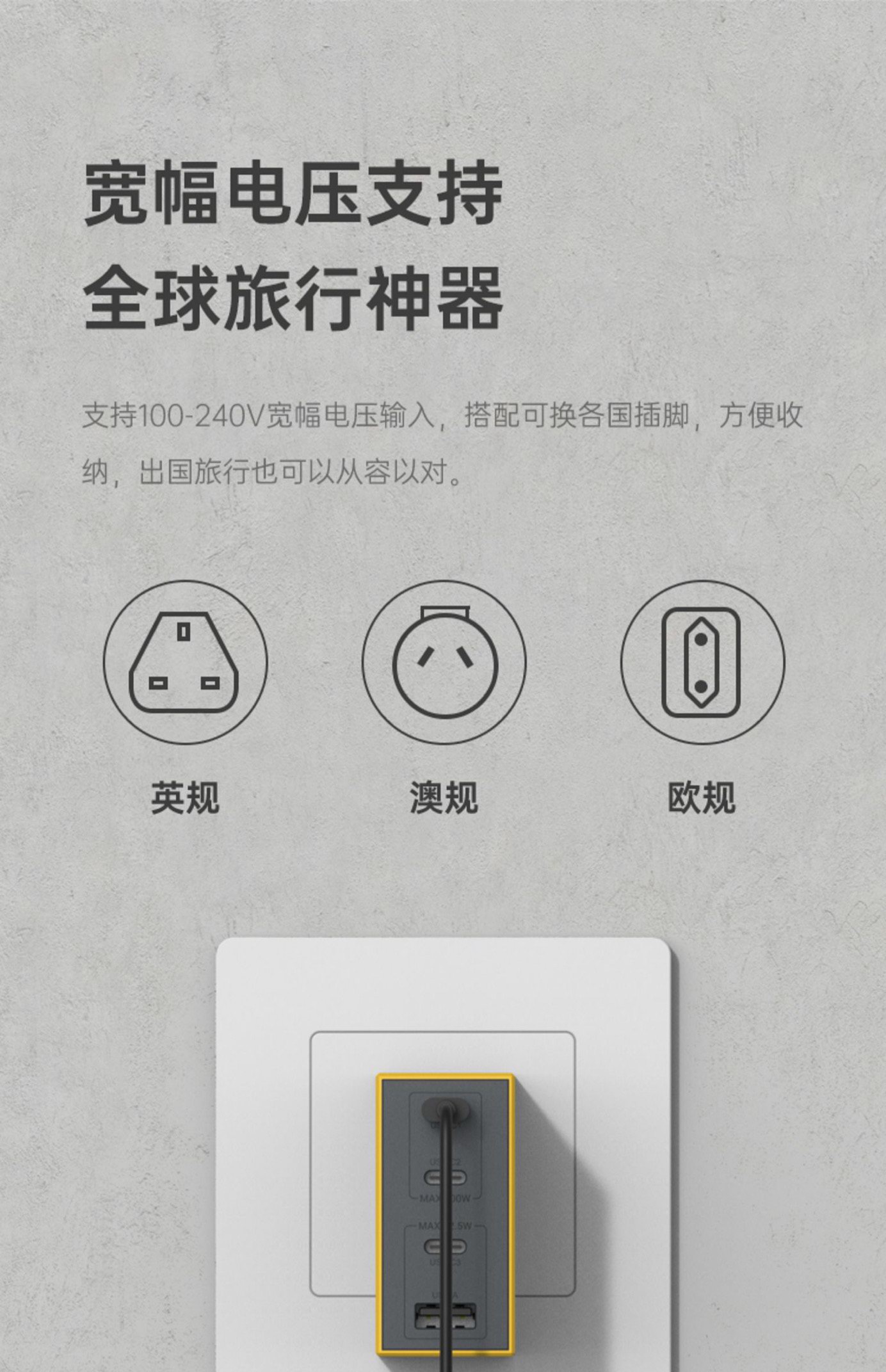 在目前的100W氮化鎵充電器中,閃極S100Pro 是為數不多支持替換不同國家地區插腳的產品,同時輸入支持100-240V 50/60Hz寬幅電壓適用于全球電網,陪伴用戶輕松差旅無需擔心兼容問題。