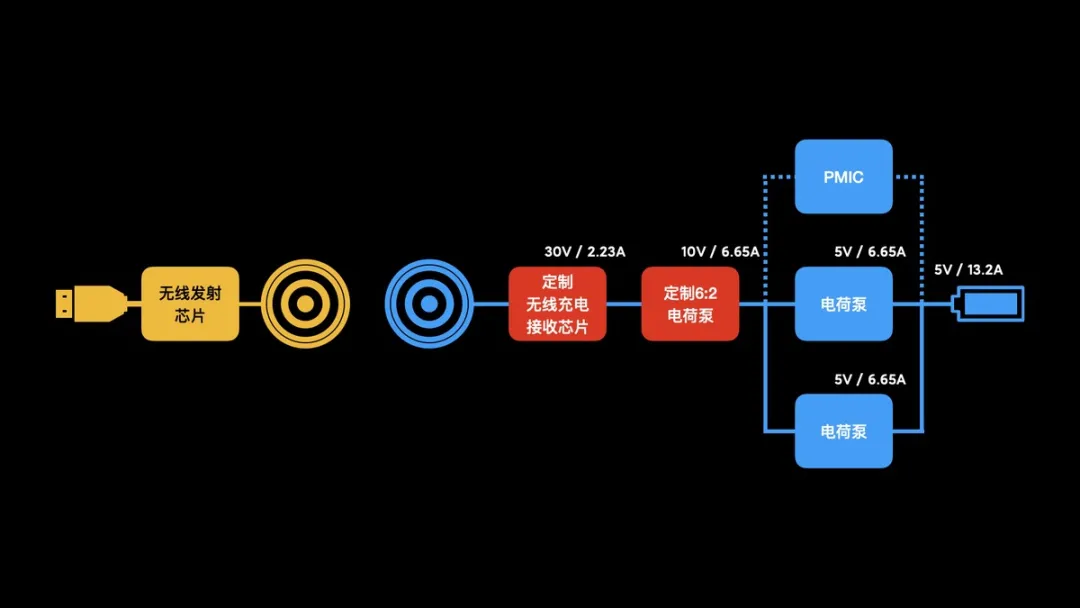 為了兼容80W無線充電,小米11Pro這套方案內部采用了前后兩級電荷泵,前級電荷泵是小米定制的6:2電荷泵,與定制的無線充電接收芯片協同工作,將30V輸入的無線充電電壓降壓到10V。后級電荷泵與有線充電共用,是常見的2:1電荷泵,最終實現30V to 10V to 5V的6:1降壓。