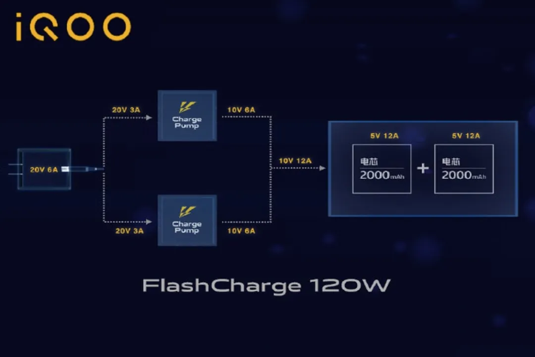 vivo旗下iQOO的120W FlashCharge超快閃充供電端使用了20V6A充電器,進入手機后分為雙路20V3A再各自使用一顆電荷泵分壓輸出10V6A,最后合并成10V12A對兩串電芯進行高壓直充。