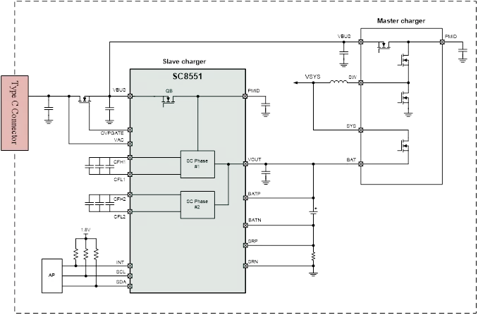 SC8551是南芯針對手機快充市場推出的電荷泵快充IC。作為國內首款大批量出貨的高壓電荷泵快充IC,SC8551還開創實現了高壓快充和低壓直充雙模式充電功能。SC8551采用56Pin的CSP封裝,芯片尺寸為3.32mm*3.35mm。在充電過程中,SC8551作為主從充電架構中的從充電IC,在手機進入快充階段后開始工作,其主要特點如下: