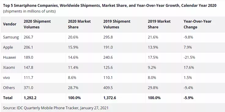 根據權威市調機構IDC發布的最新數據顯示,2020年全球智能手機出貨量達12.9億部。其中三星和蘋果分列第一第二,剩下便是中國軍團。