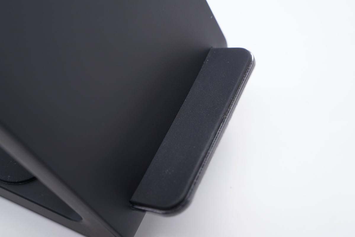 底座設有耳機無線充,貼有一塊防滑硅膠墊,中心印有“十”字表示無線充區域。