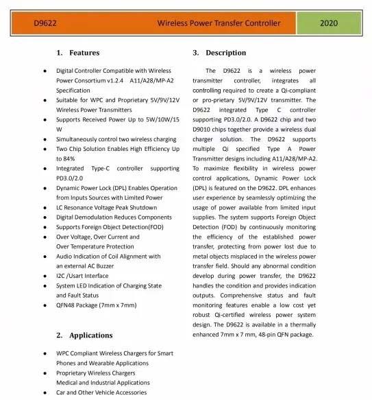 手機和耳機無線充主控芯片采用貝蘭德D9622,這是一款全同步數字解調無線充TX芯片,其具有如下特點: