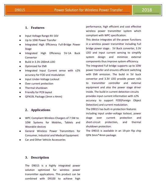 內置2%高精度的輸入電流檢測,用于異物檢測和解調,支持過流保護和熱關斷,對PCB布線友好,采用3*4mm QFN19L 封裝。D9015集成功率級可以提供5V供電,減少外圍元件數量,提供更多功能。