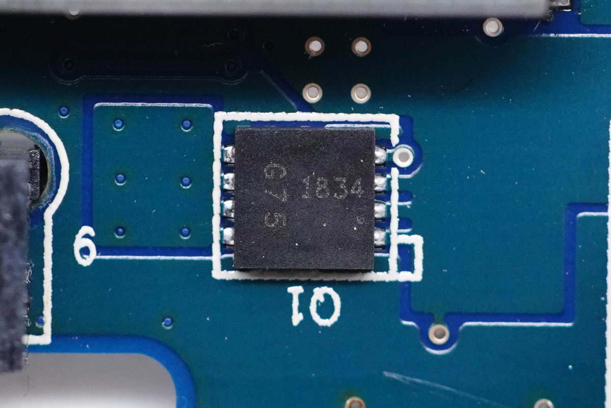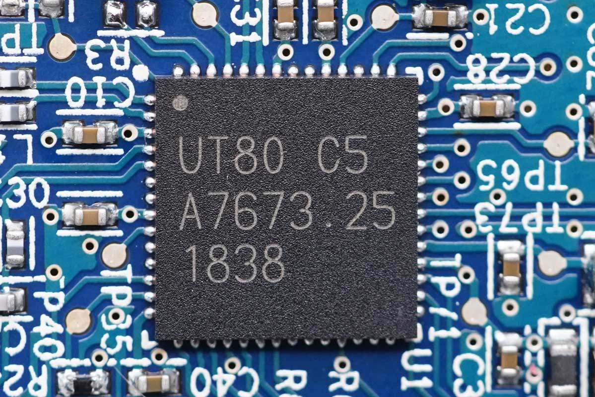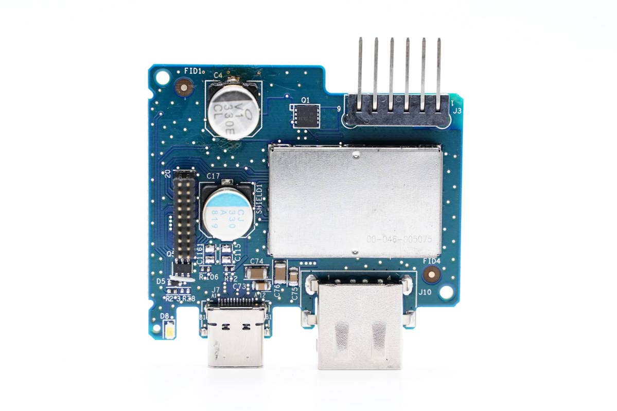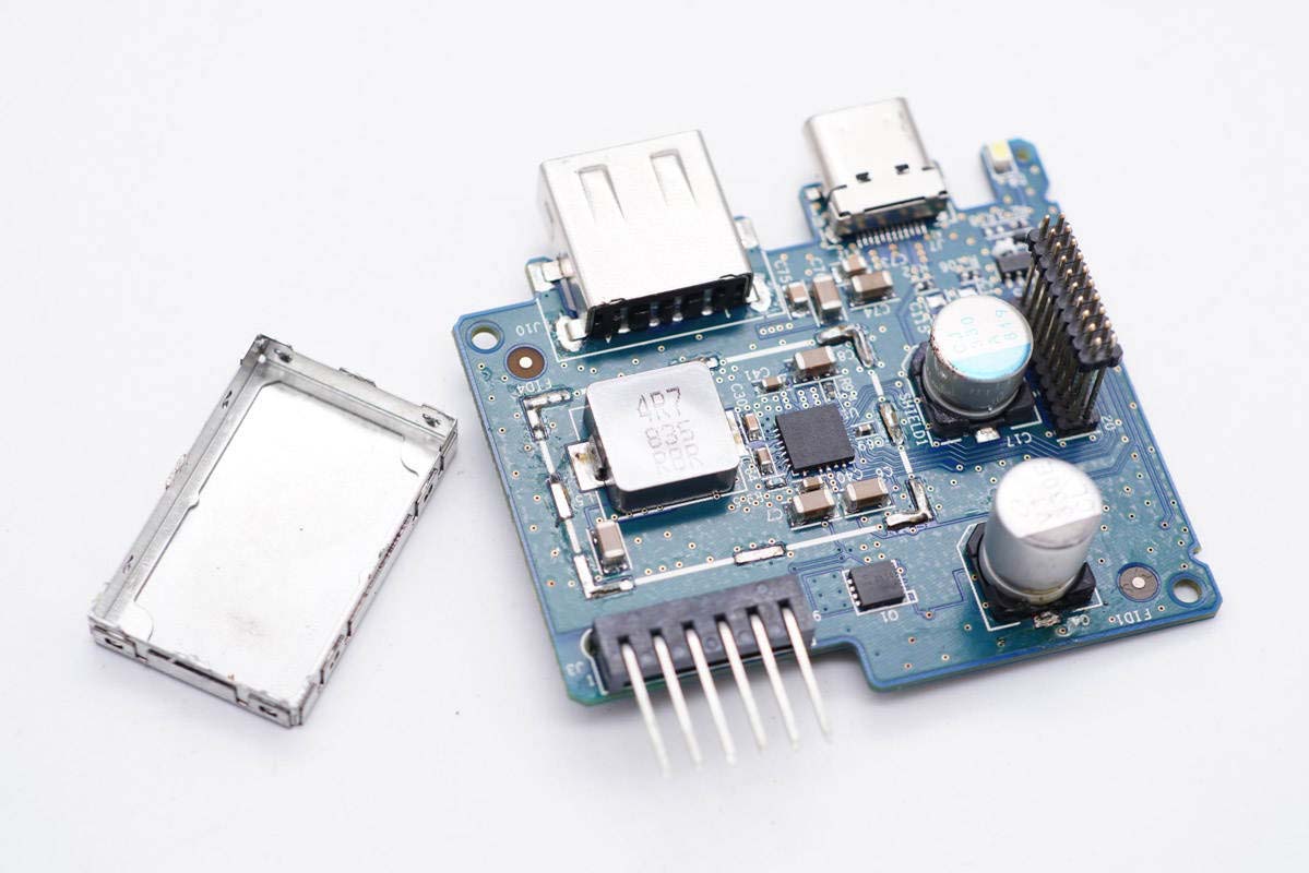 USB母座所在小板正面一覽。右側區域設有屏蔽罩,左側設有兩顆電容。