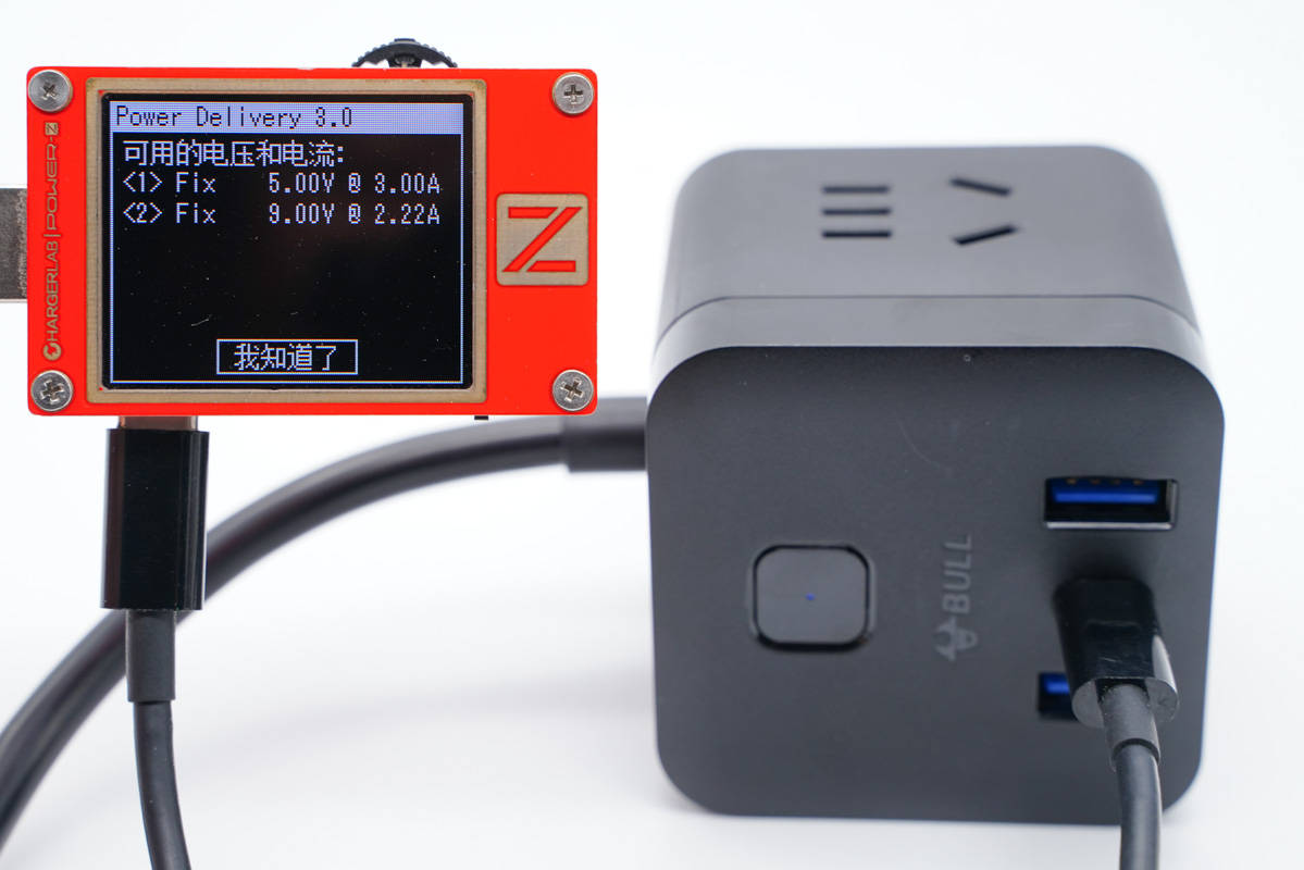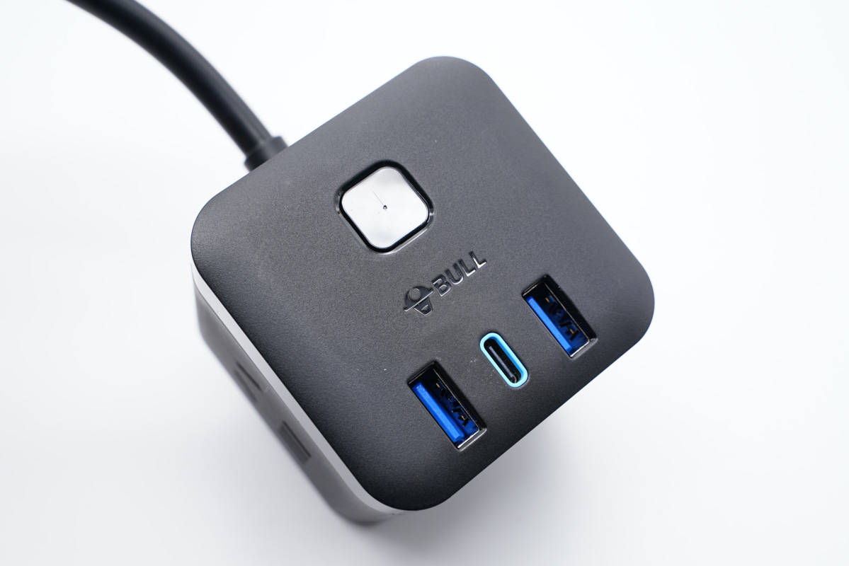 頂部配有電源鍵以及2A1C三個USB接口,中心凹印BULL品牌logo。兩個A口采用藍色膠芯,C口采用黑色膠芯,不過配有一個藍色塑料環裝飾。