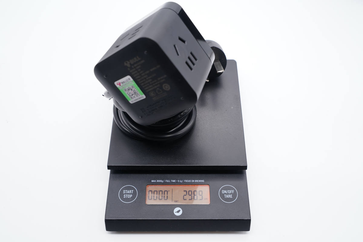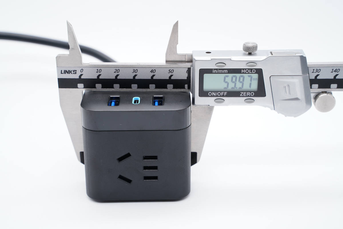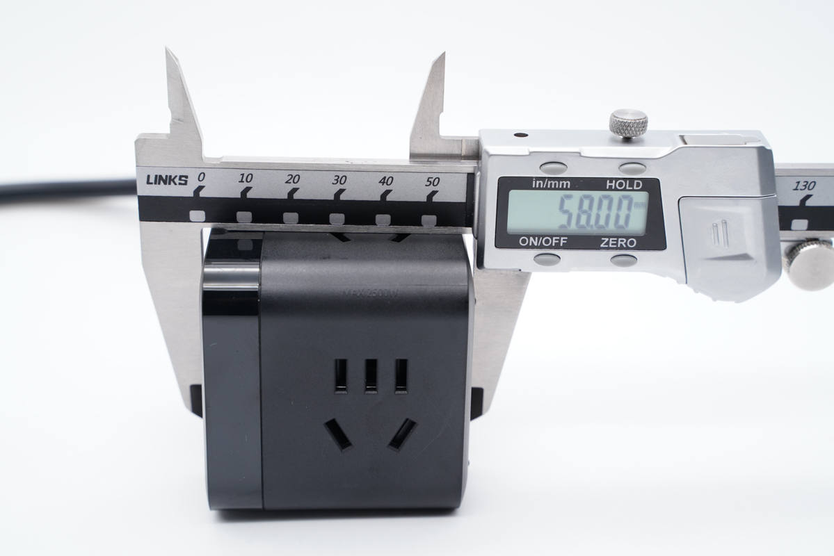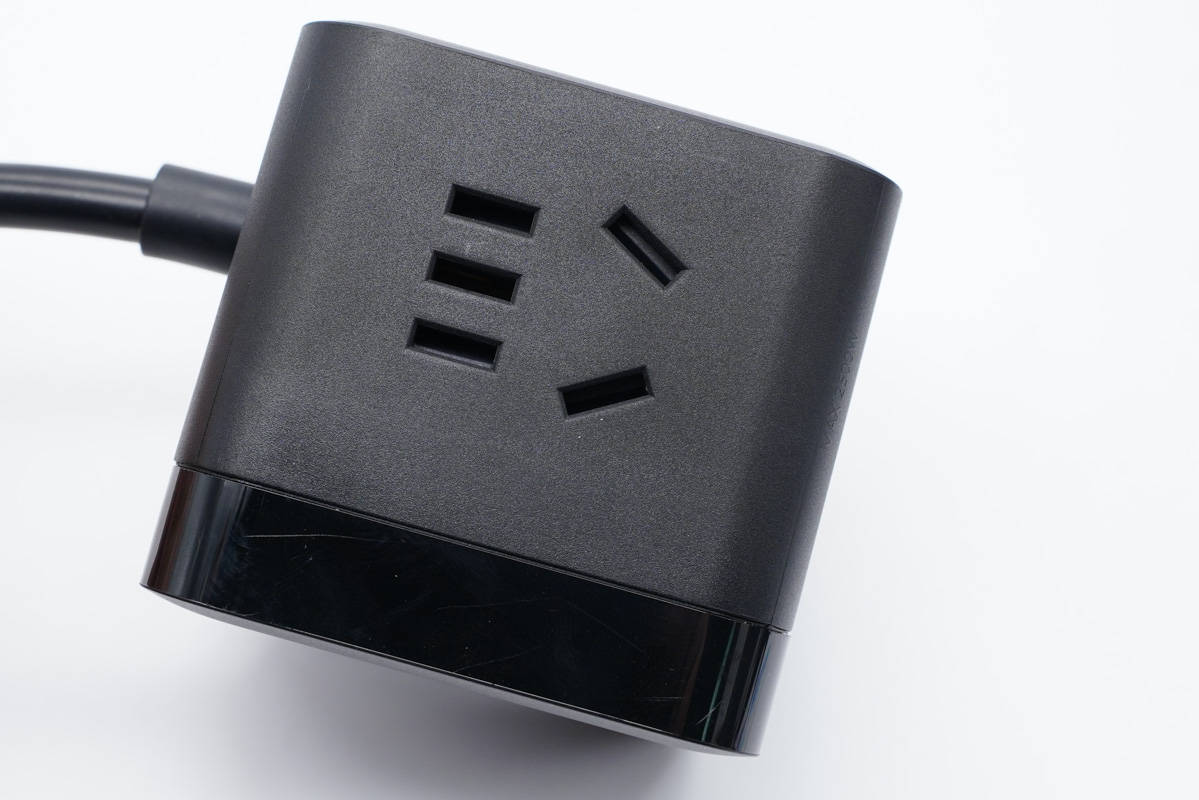 插座機身是立體方塊造型,PC材質黑色外殼,六面基本磨砂處理,腰身各面之間過渡圓潤,整體十分有氣質。