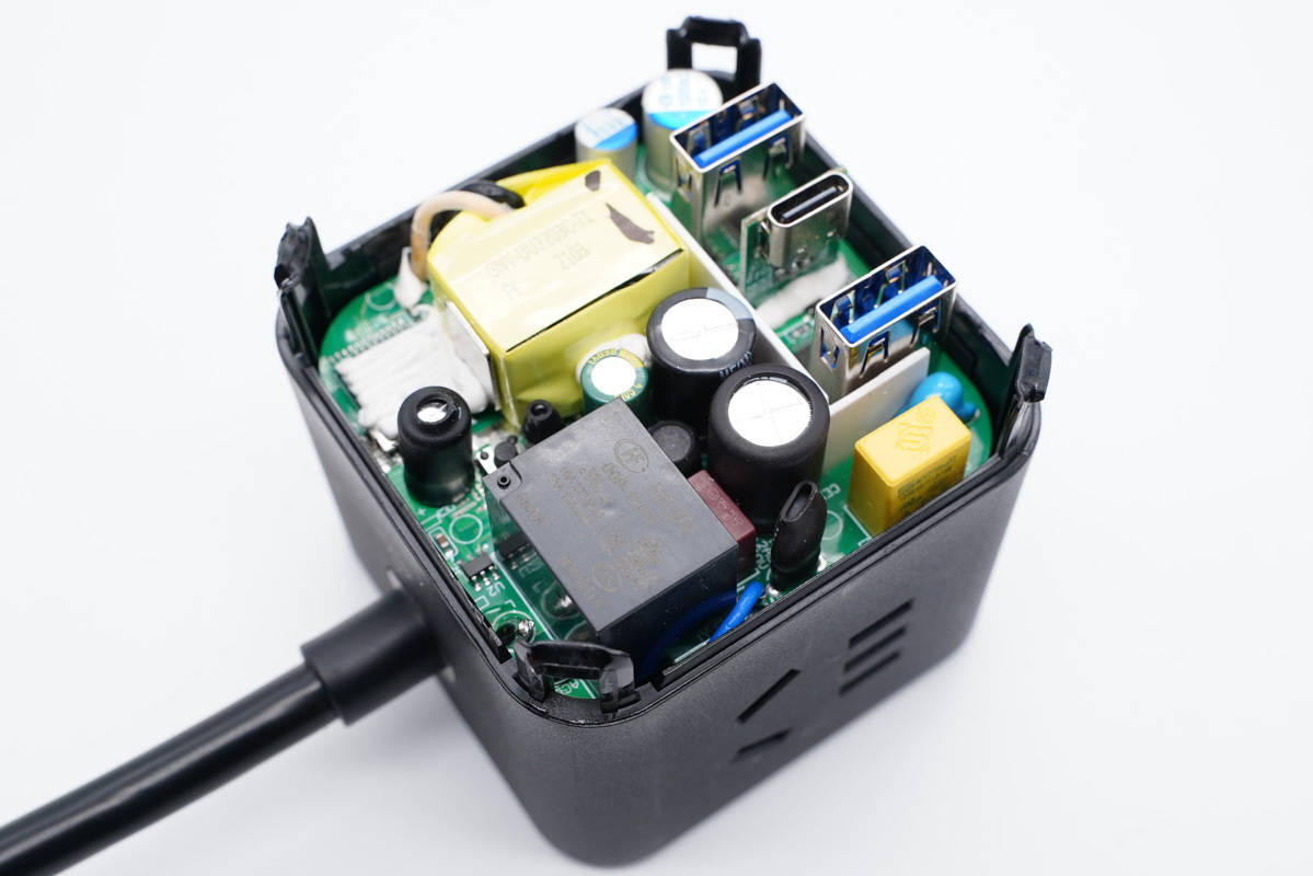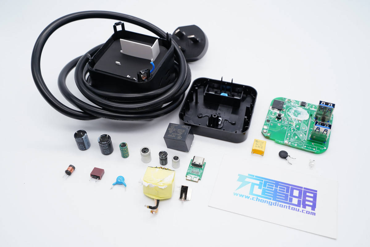 充電頭網通過拆解發現,充電器內部設計有繼電器控制電路,開關電源部分由PI SC1548C搭配華潤微同步整流MOS組成,采用天德鈺FP6601AA和JD6606S兩顆協議芯片協同控制2A1C三個輸出接口,綠寶石電解電容以及固態電容進行輸入輸出濾波,產品整體做工可靠。