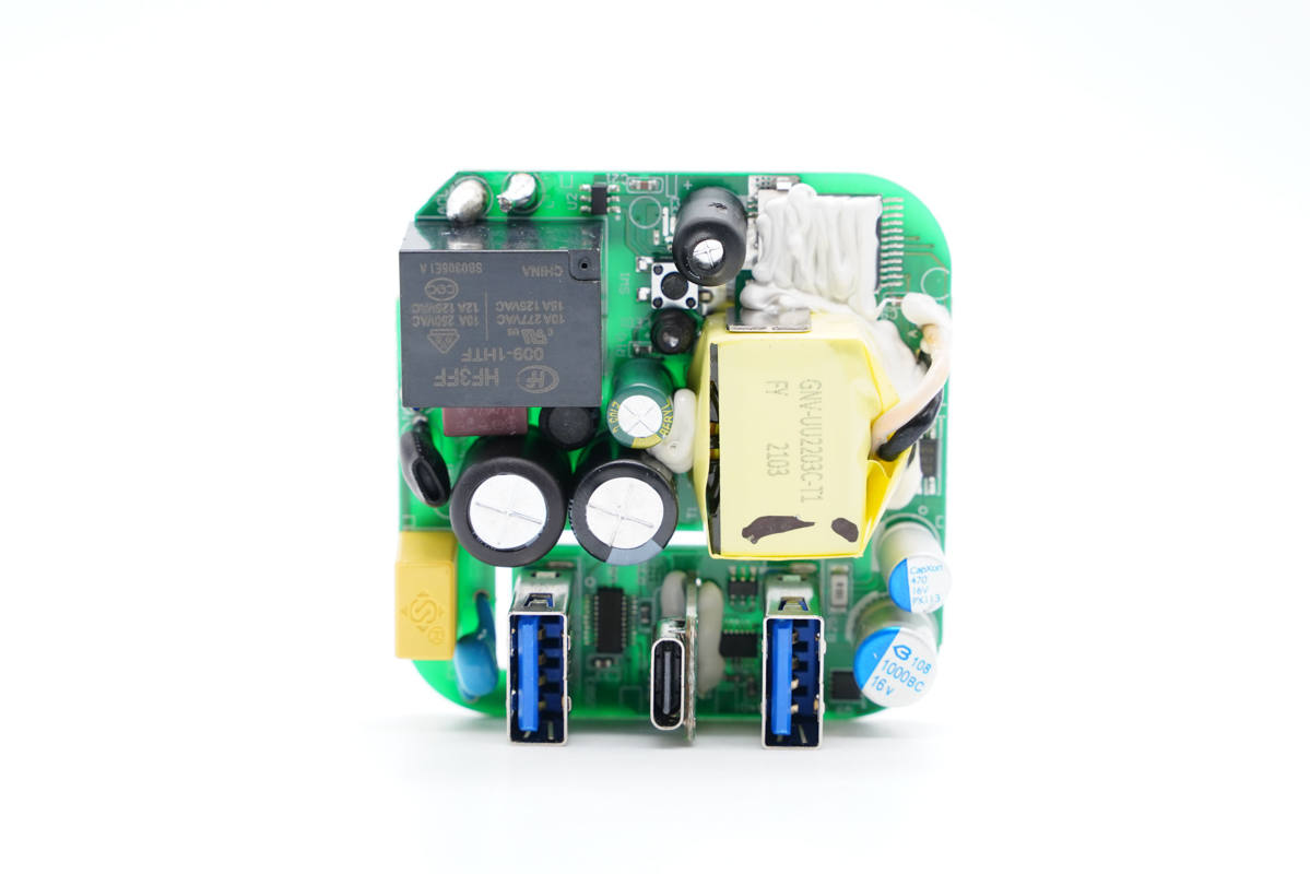 PCB板正面一覽,除了充電器的元器件外,左上角還有繼電器,用于整個插線板的輸出控制,變壓器打膠加固。