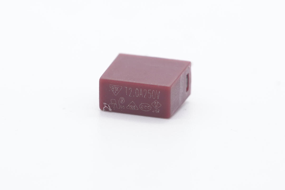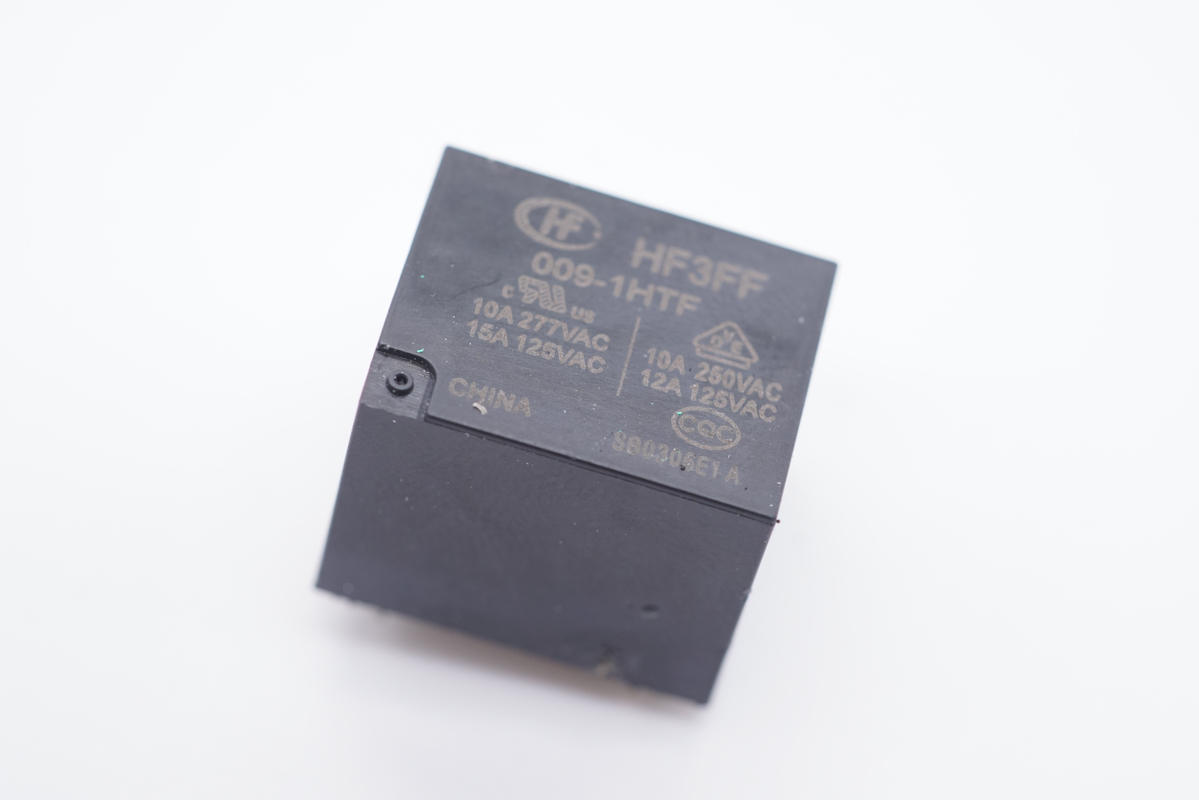 黑色繼電器特寫,來自廈門宏發電力電器有限公司,用于轉換器輸出控制。