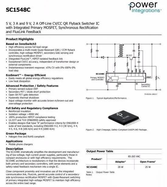 來自PI的主控芯片SC1548C,內置反激式控制器、初級開關管,以及次級側檢測和同步整流控制器,此外還帶有HIPOT隔離保護的集成反饋鏈路,集成度非常高。使用時無需搭配光耦,內建多重保護功能,芯片正面涂有導熱膠幫助散熱。