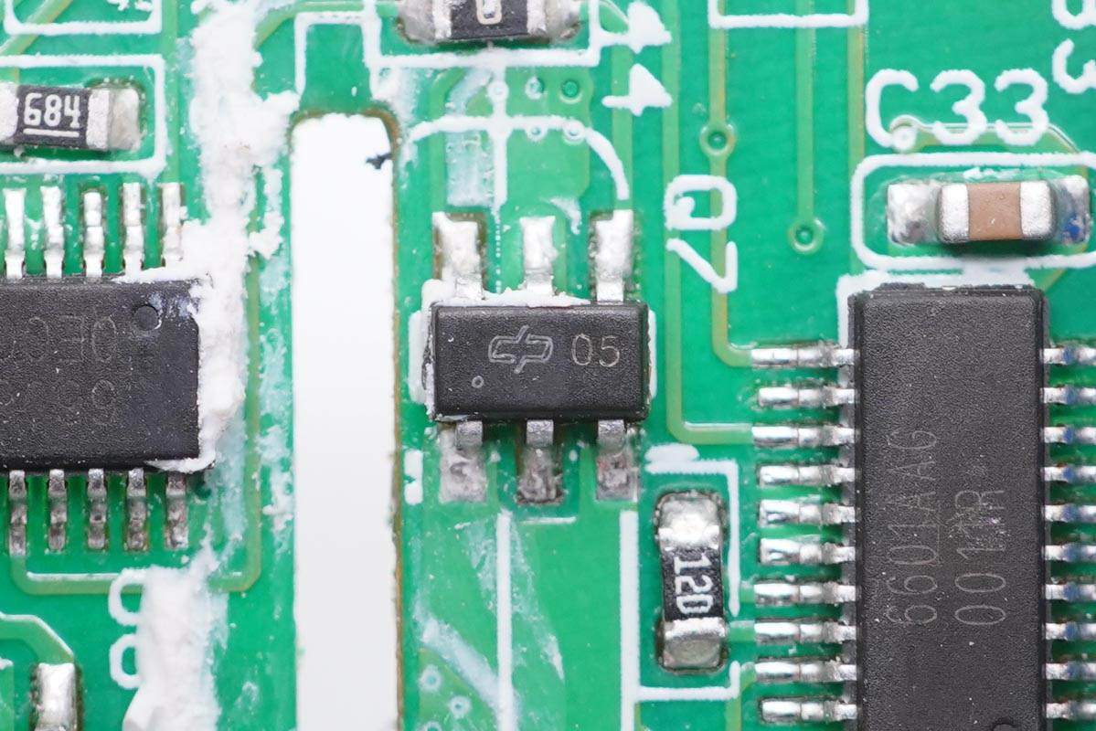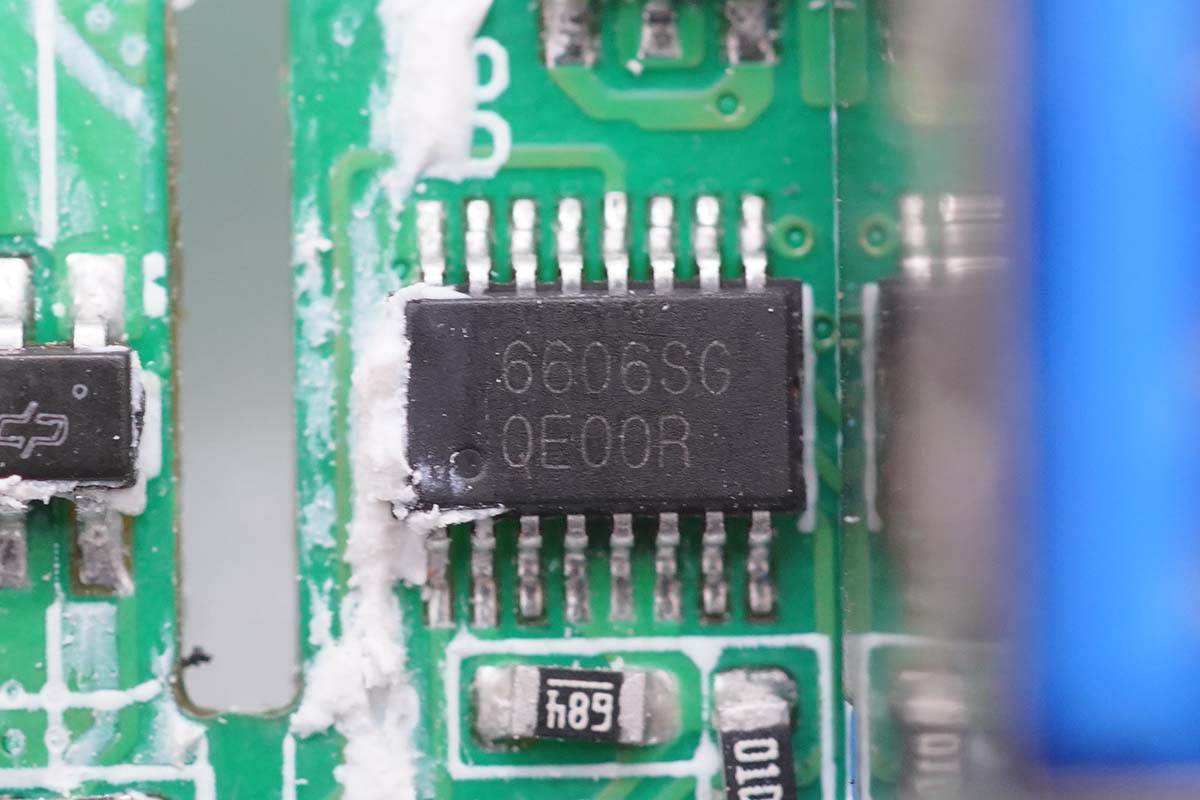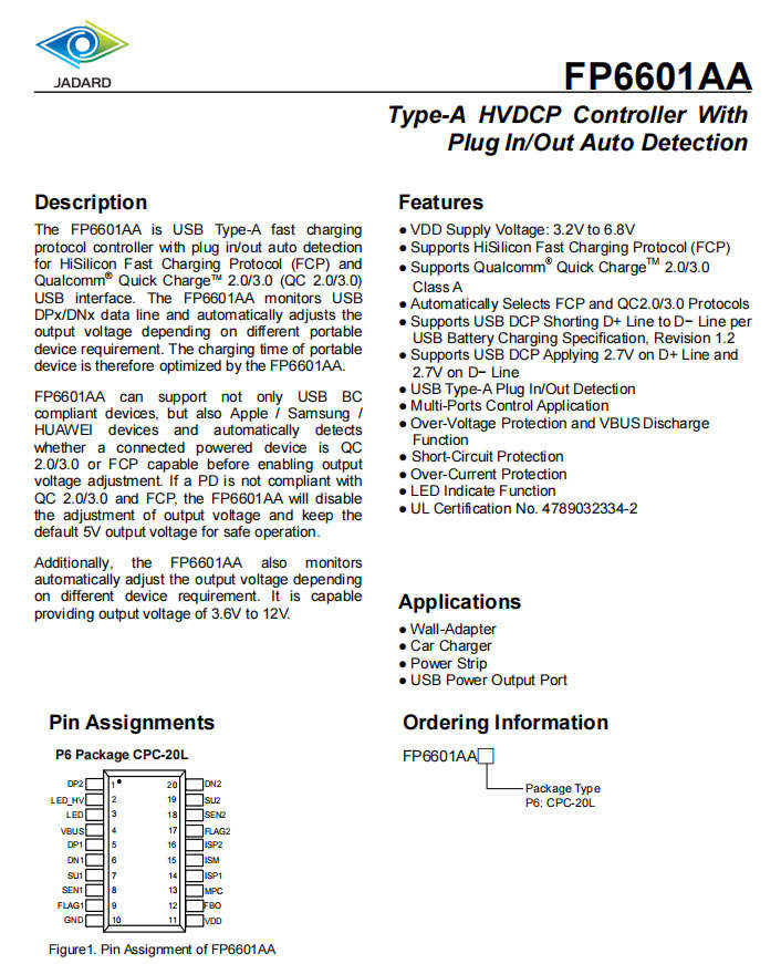 兩個USB-A口的協議芯片采用天德鈺FP6601AA,這是一顆雙USB-A口協議芯片,支持QC2.0/3.0、FCP等快充協議,并支持多路協同工作,實現任意單口快充,多口5V輸出。