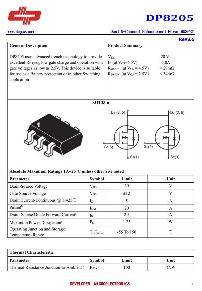USB-A母座輸出VBUS開關管特寫,德普微DP8205,NMOS管,耐壓20V,SOT23-6封裝。