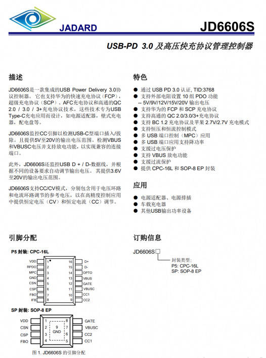 天德鈺JD6606S提供恒壓恒流控制,支持多口輸出控制,支持輸出過壓,過流保護,并且集成VBUS放電功能,輸出協議由電阻靈活配置,并且支持多口輸出降功率,支持最大60W到最小18W輸出,滿足主流PD適配器輸出。