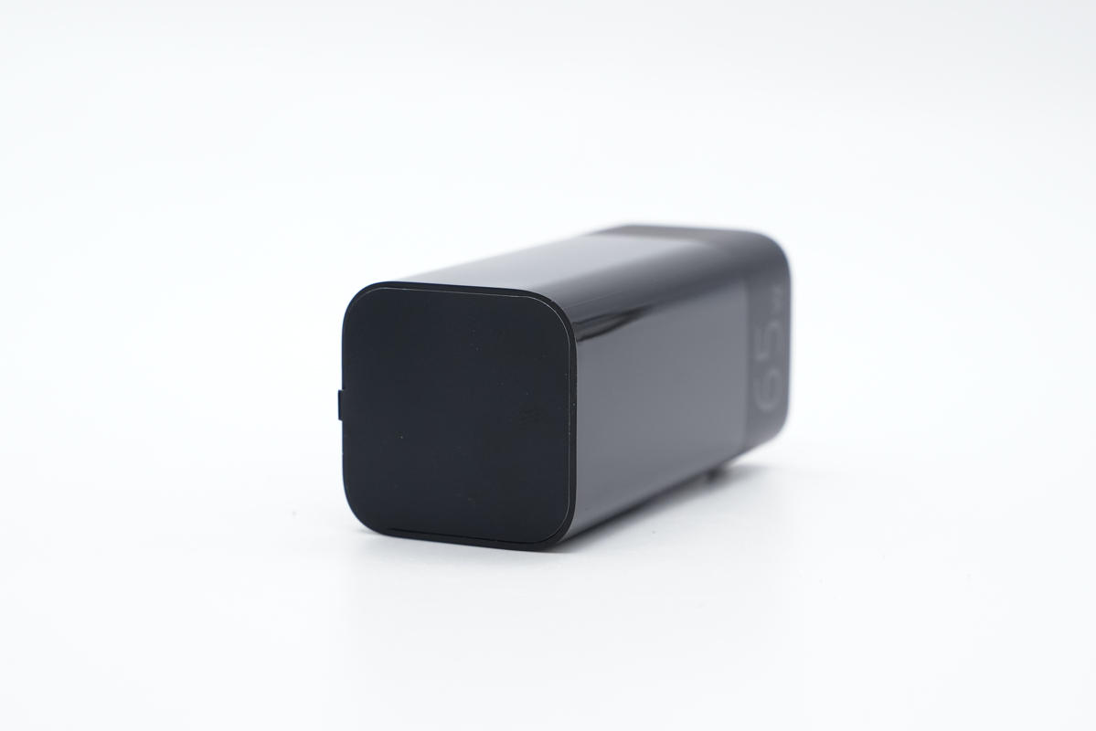 腰身采用亮面和啞光撞色設計,底部設計有“65W”字樣,表明充電器最大輸出功率。