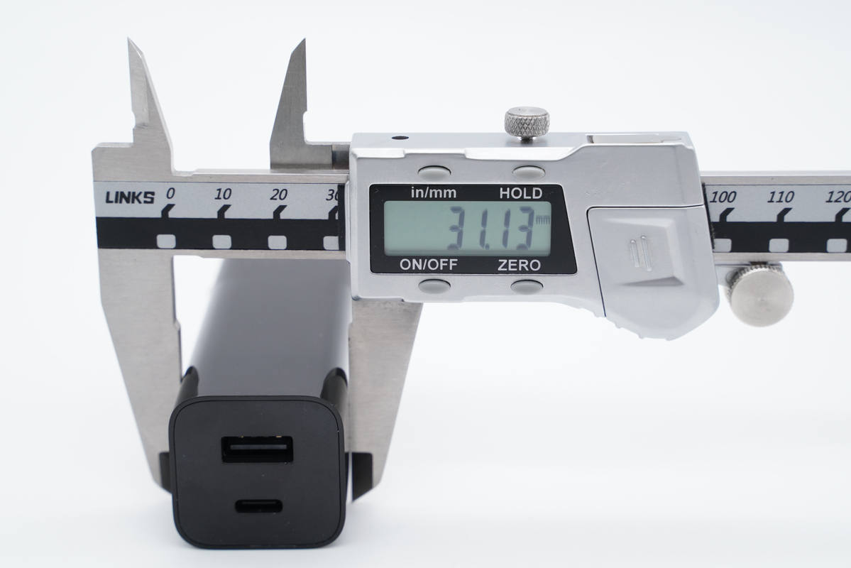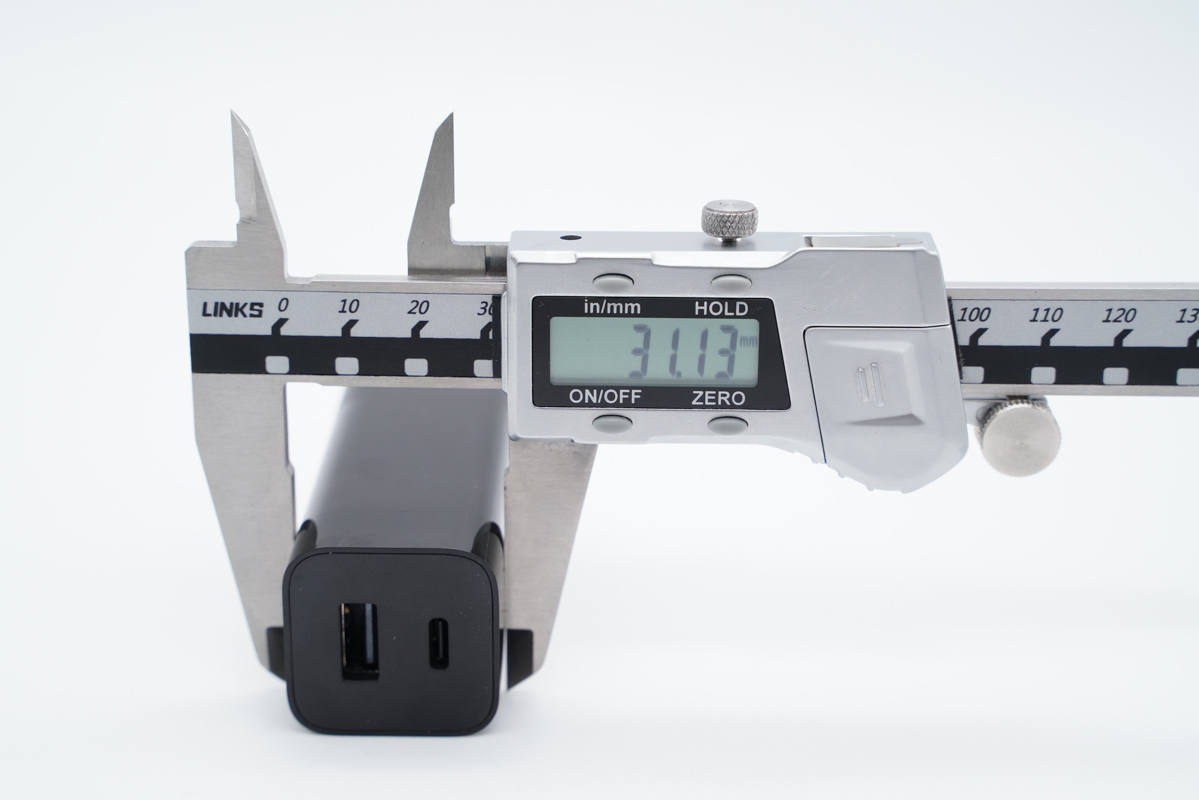 使用游標卡尺實測充電器機身長度為71.73mm。