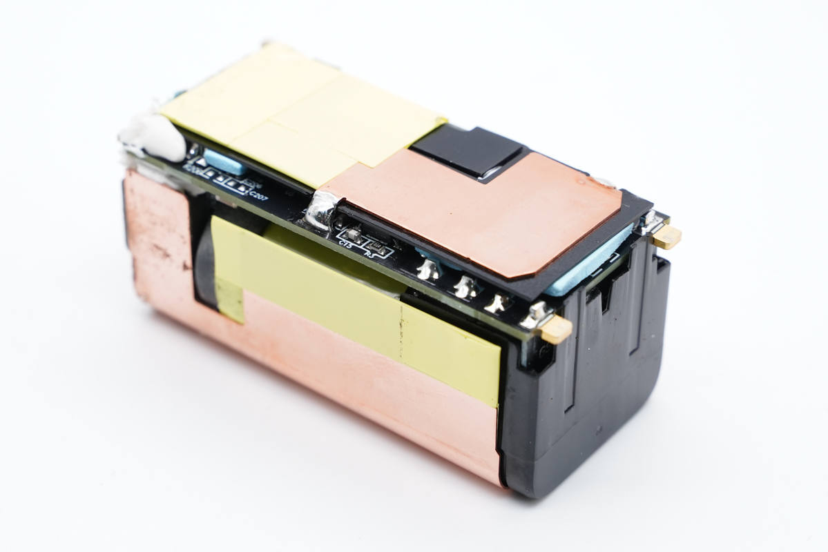 將散熱片、輸入端塑料殼等全部拆掉,模塊側(cè)面的平面變壓器小板兩端還各配有一塊鋁散熱塊,包裹膠帶絕緣。