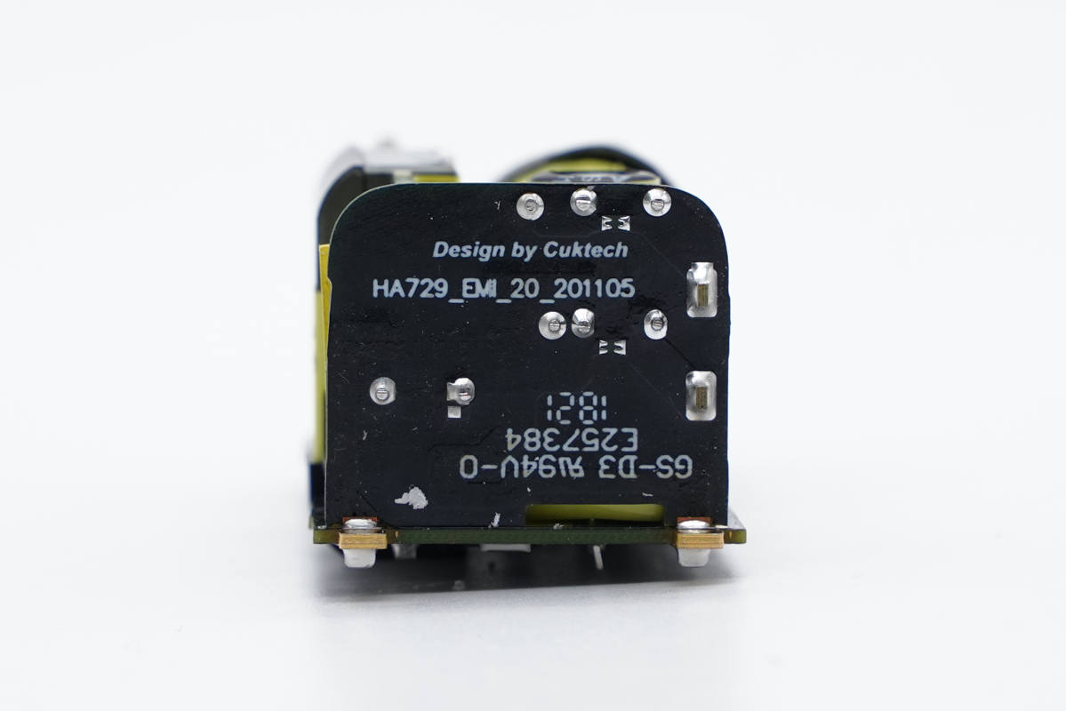 輸入端小板背面印有Design by Cuktech,即這款充電器由南京酷科電子科技有限公司設計。另外小米GaN充電器65W(1A1C)、小米GaN充電器Type-C 65W以及小米GaN充電器Type-C 33W三款充電器也都是有南京酷科電子科技有限公司設計。