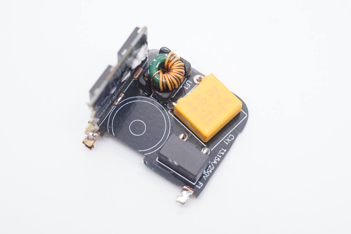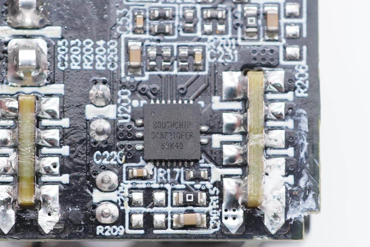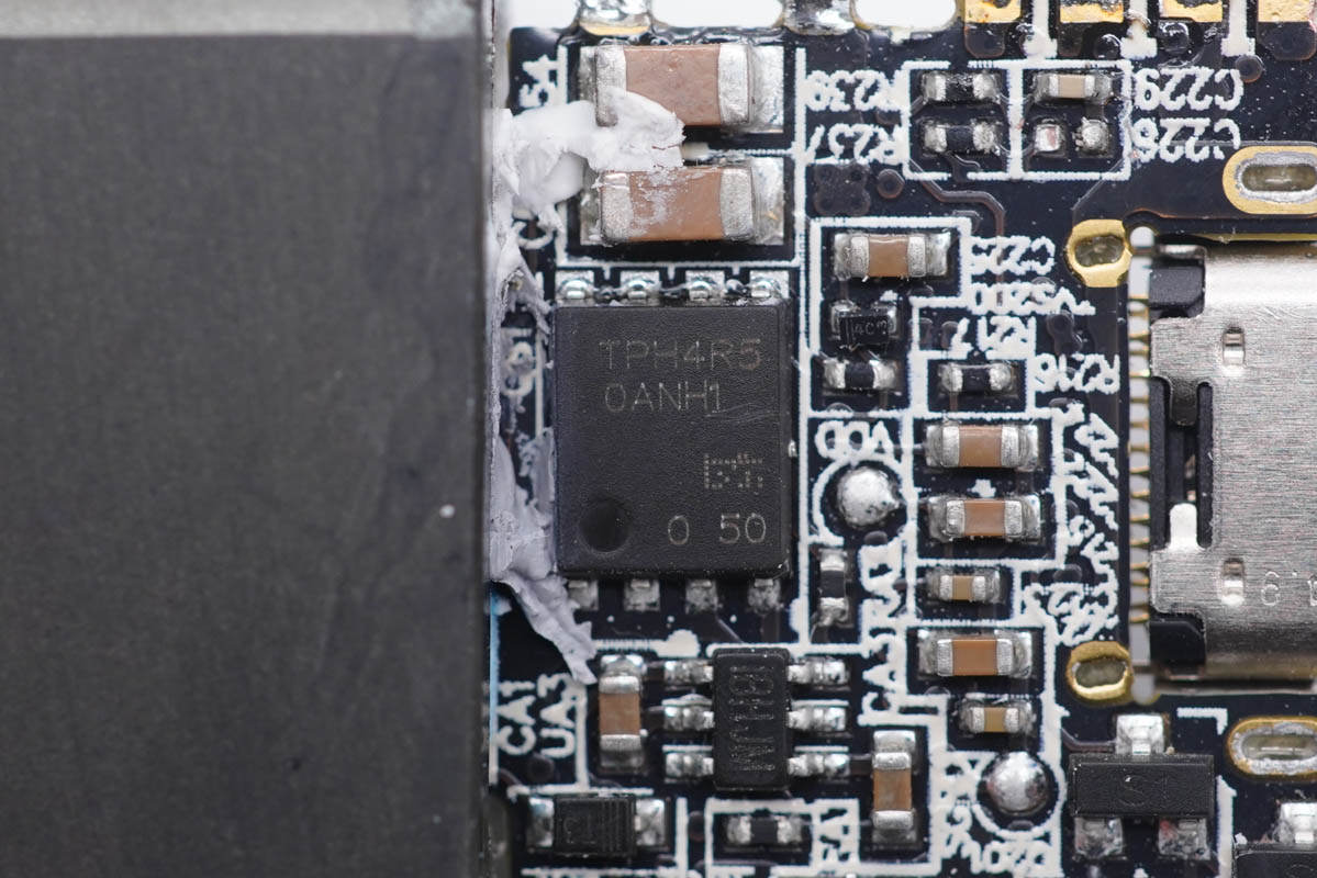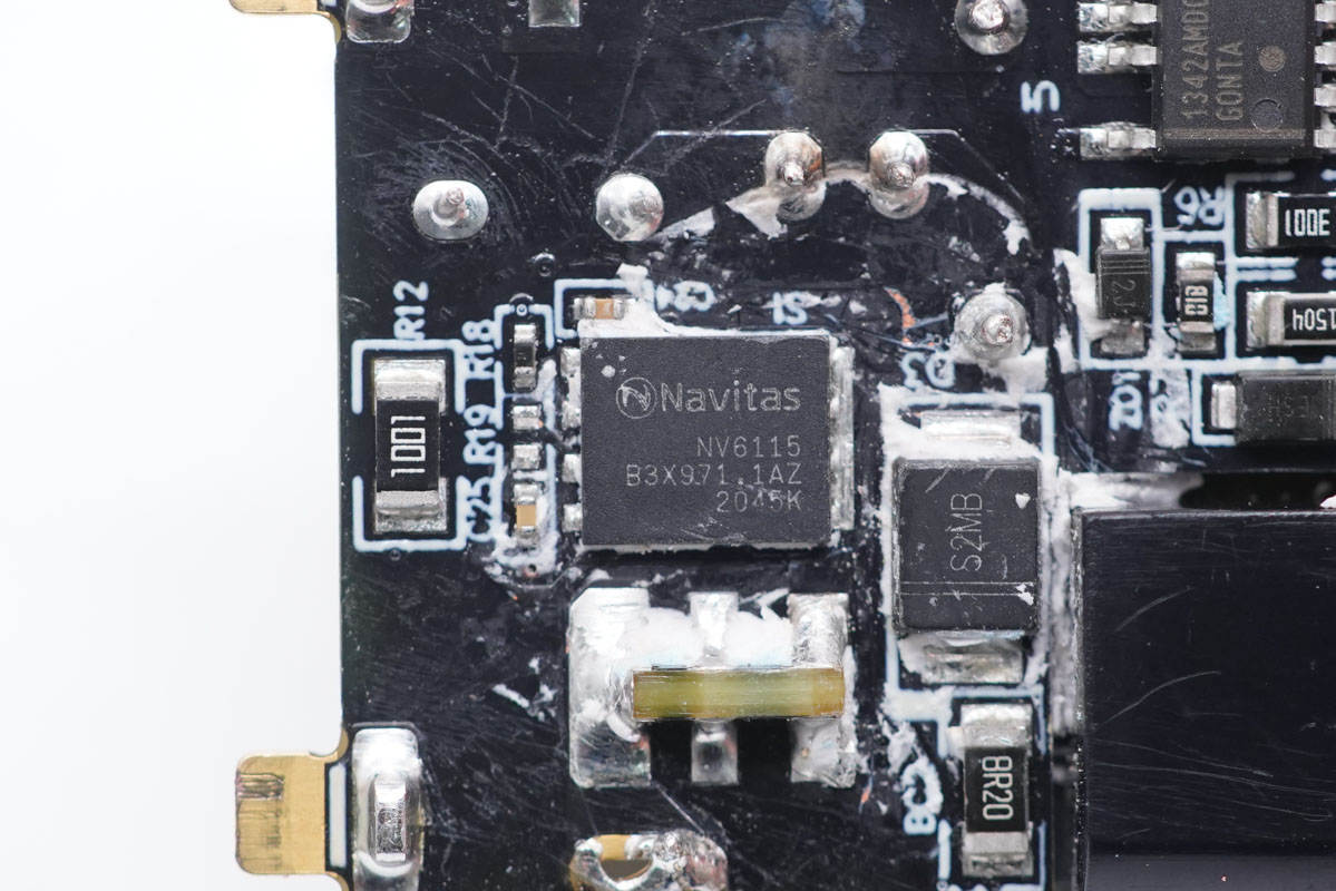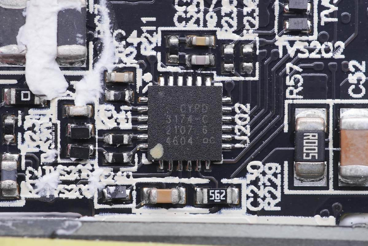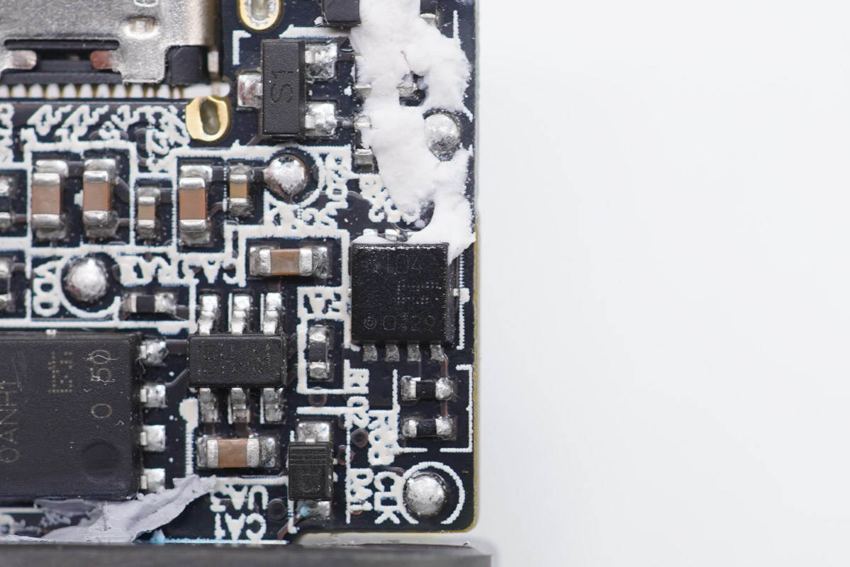 主板背面一覽,平面變壓器對應區(qū)域鏤空,以降低厚度。主板背面從上而下可以看到氮化鎵功率芯片、主控芯片、光耦和貼片Y電容,以及用于A口輸出的同步升降壓轉(zhuǎn)換器等器件。
