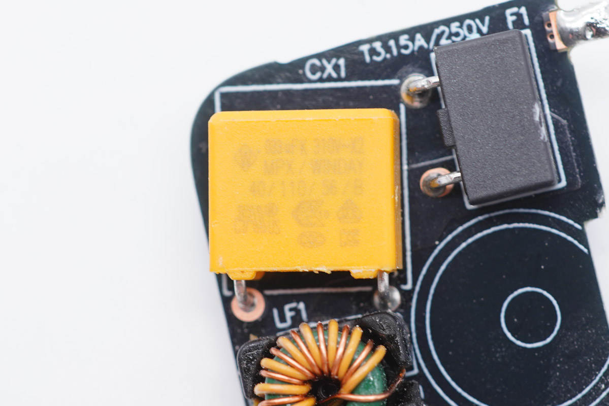 通過觀察發(fā)現(xiàn),紫米65W 1A1C氮化鎵快充充電器采用高頻QR開關電源寬范圍輸出,USB-A口同步整流升降壓,兩個接口使用一顆協(xié)議芯片控制輸出電壓的設計架構(gòu)。下面我們從輸入端開始一一了解各器件的信息。