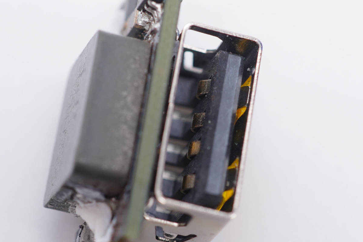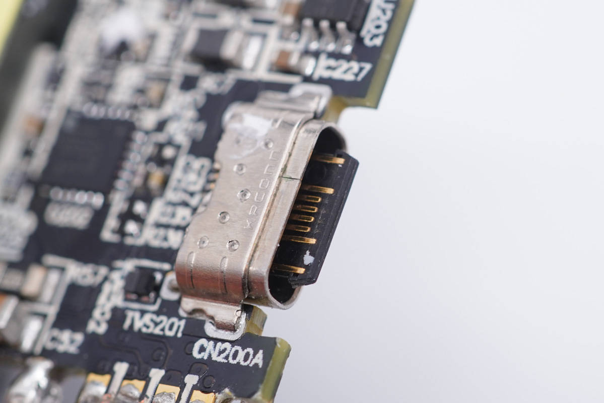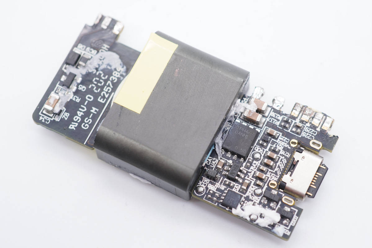 將平面變壓器小板拆下,輸出端可以看到同步整流控制器以及整流管,還有一顆VBUS開關管。USB-C母座沉板焊接。
