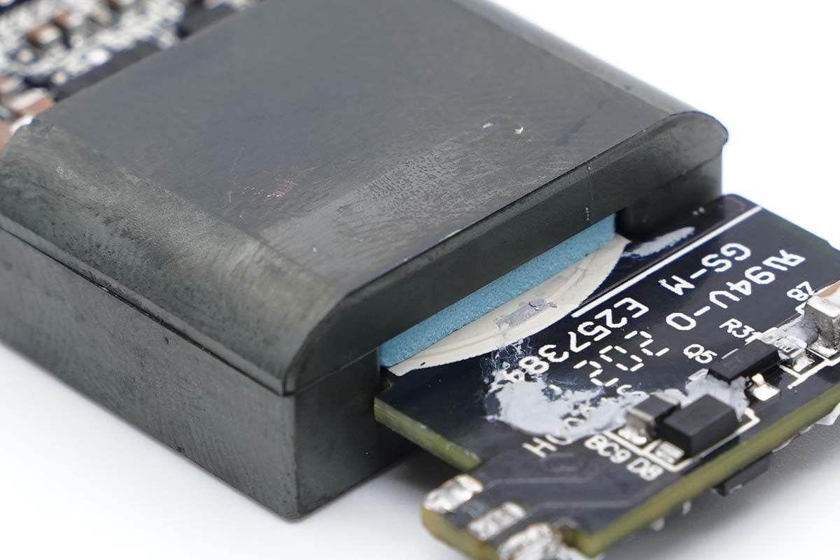 磁芯與變壓器電路板之間塞有一塊藍色導熱墊,將線圈發(fā)熱傳導至磁芯加強散熱。