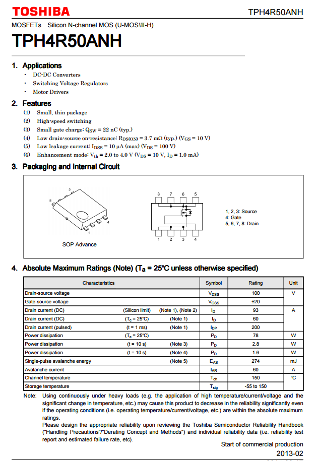 同步整流管為東芝TPH4R50ANH,100V耐壓,導阻3.7mΩ,適合于DC-DC轉(zhuǎn)換器,開關穩(wěn)壓器和馬達驅(qū)動。