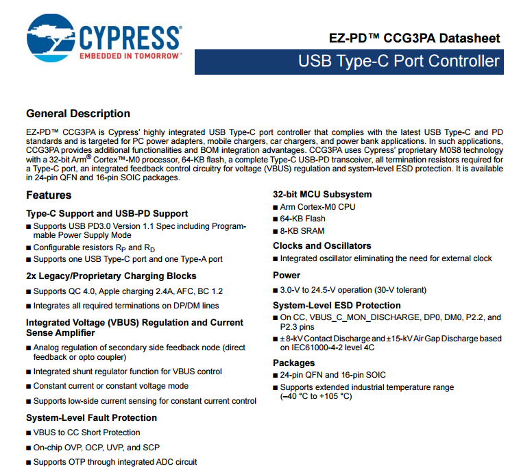 USB PD快充協(xié)議芯片采用賽普拉斯CYPD3174,該芯片支持PD3.0包括PPS協(xié)議,支持QC4.0,蘋果2.4A等其他快充協(xié)議;內(nèi)置多重全面的保護功能,內(nèi)置32位 M0處理器,集成振蕩器且無需外部時鐘。