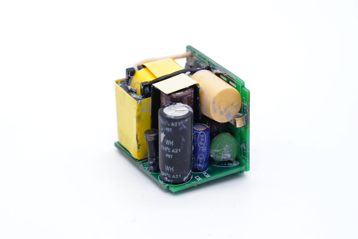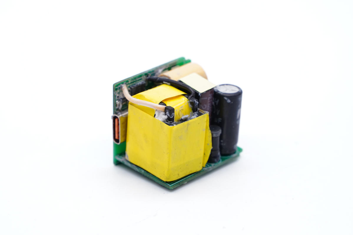 變壓器特寫,通體纏繞膠帶絕緣。充電頭網(wǎng)了解到,該變壓器為深圳金尚電子科技有限公司生產(chǎn),型號:JS-3033。深圳市金尚電子科技有限公司專門為小體積高密度電源產(chǎn)品量身定制變壓器,目前很多公司小體積產(chǎn)品都用他們家變壓器。