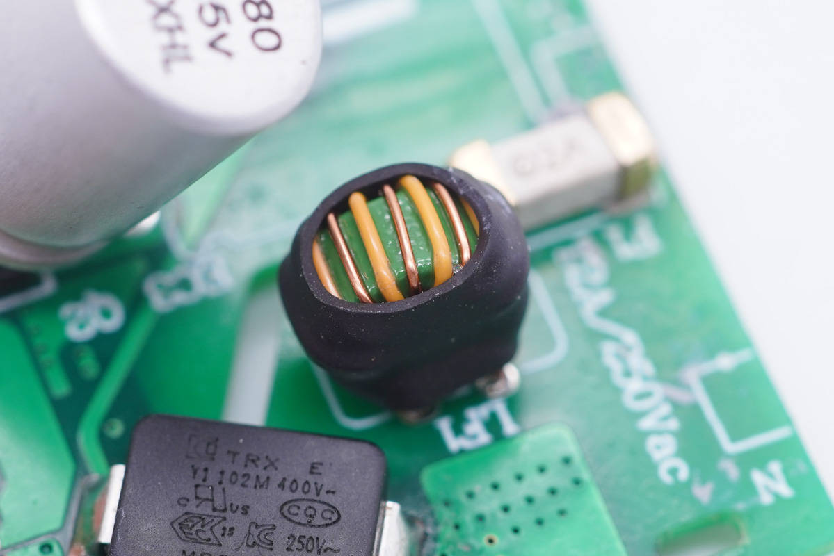 輸入端一覽,電容和變壓器間有絕緣板隔離,固態(tài)電容外套膠套絕緣。