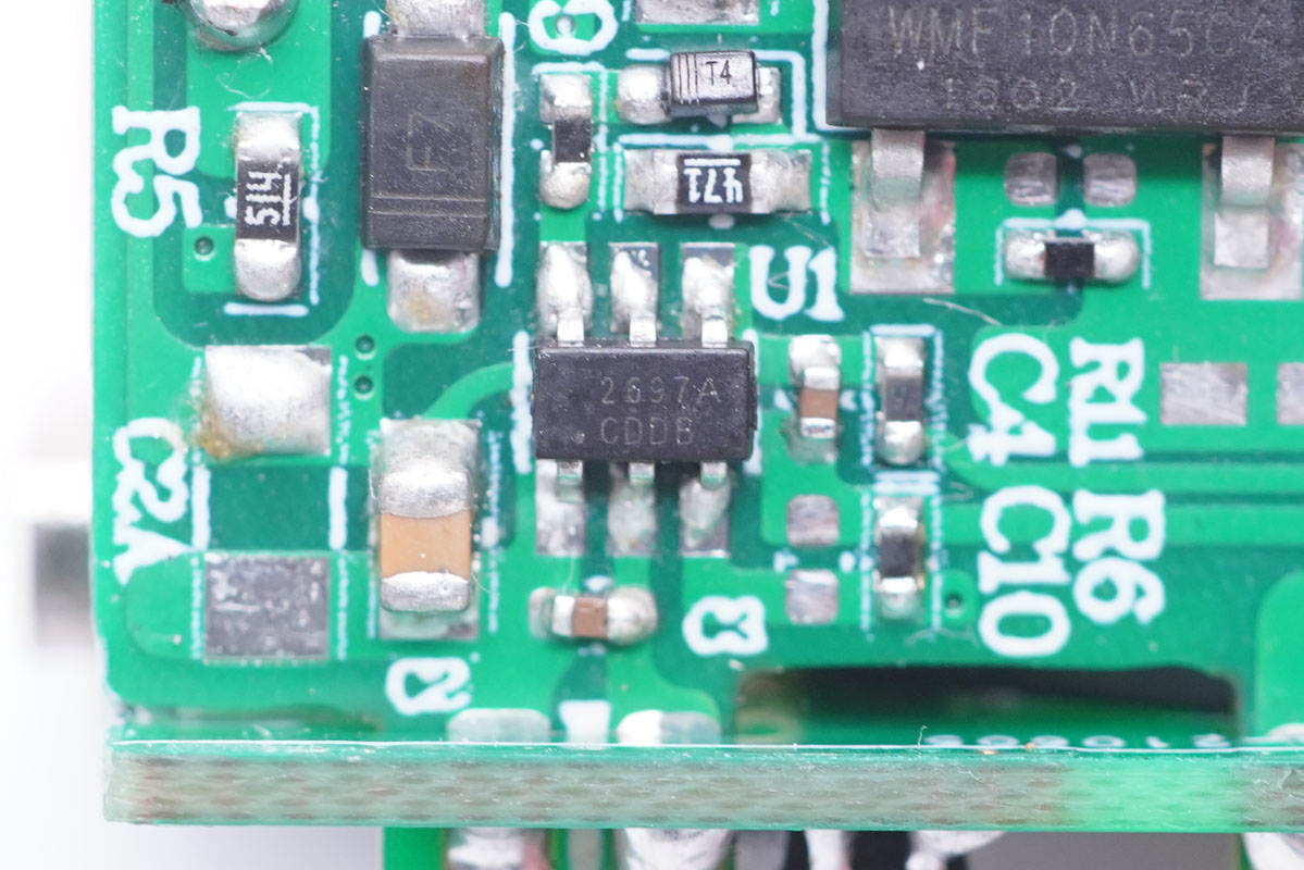 開關(guān)電源主控芯片采用茂睿芯MK2697,這是專為PD/快充應(yīng)用優(yōu)化的QR PWM控制器。該控制器寬VCC工作電壓范圍(9V-90V) 可以使其覆蓋PD/PPS從3.3V-23V的輸出范 圍而不需要使用額外的輔助繞組或者線性降壓電路。