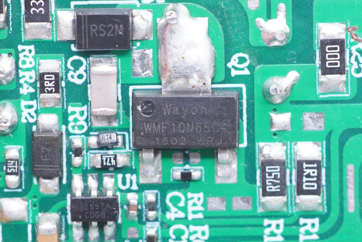 初級開關(guān)MOS管來自維安,型號WMF10N65C4。超級結(jié)NMOS管,耐壓650V,導(dǎo)阻0.52Ω,SOT223封裝。