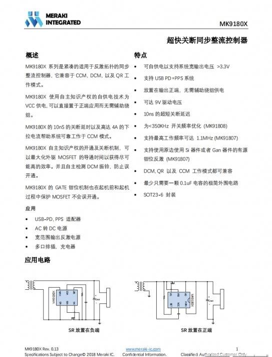 次級同步整流控制器來自茂睿芯,型號MK91808。茂睿芯MK9180X系列是緊湊的適用于反激拓?fù)涞耐秸骺刂破鳎嫒萦贑CM、DCM以及QR 工作模式;使用自主知識產(chǎn)權(quán)的自供電技術(shù)為VCC供電,可以直接置于正端應(yīng)用而無需輔助繞組。