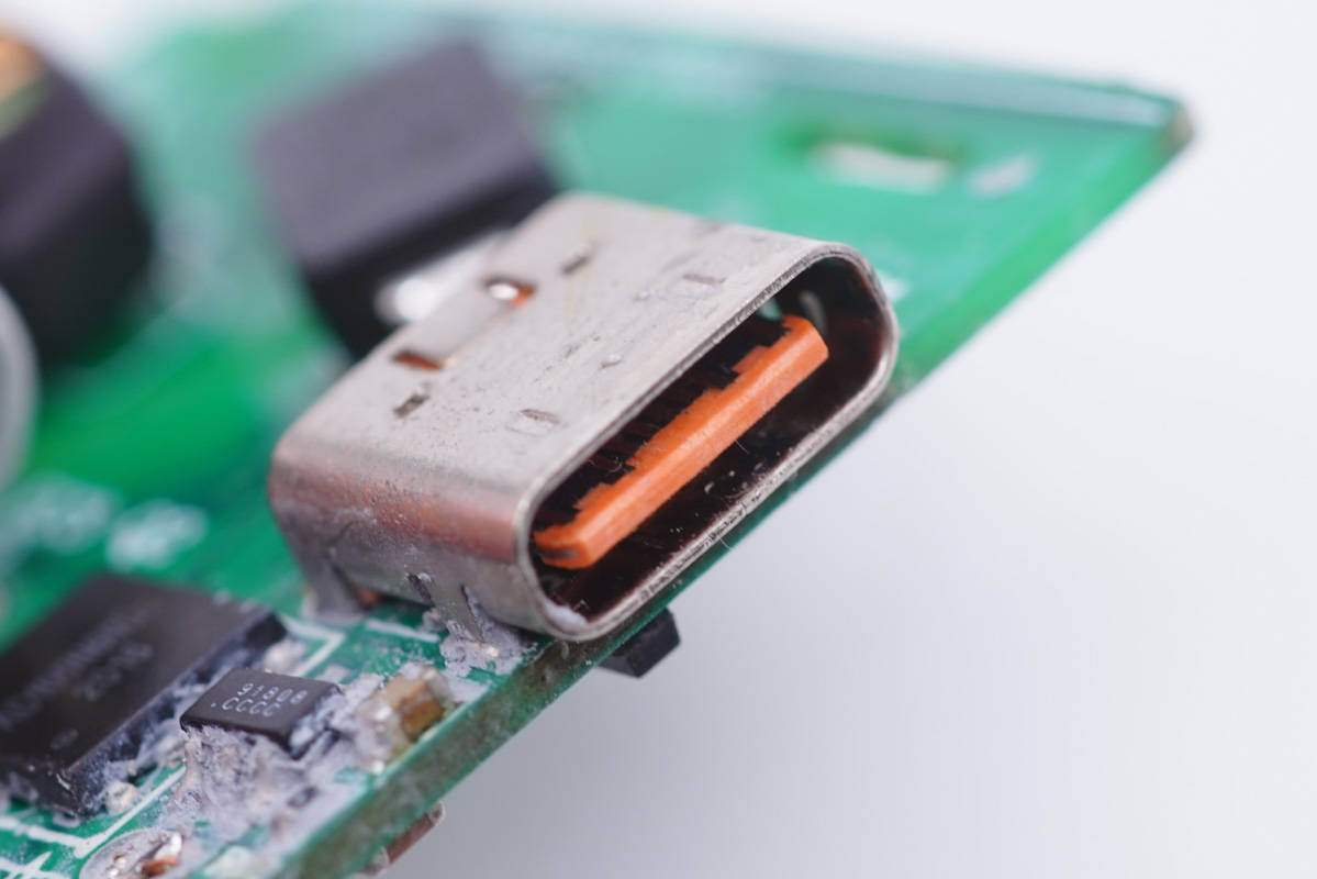USB-C母座特寫,過孔焊接。