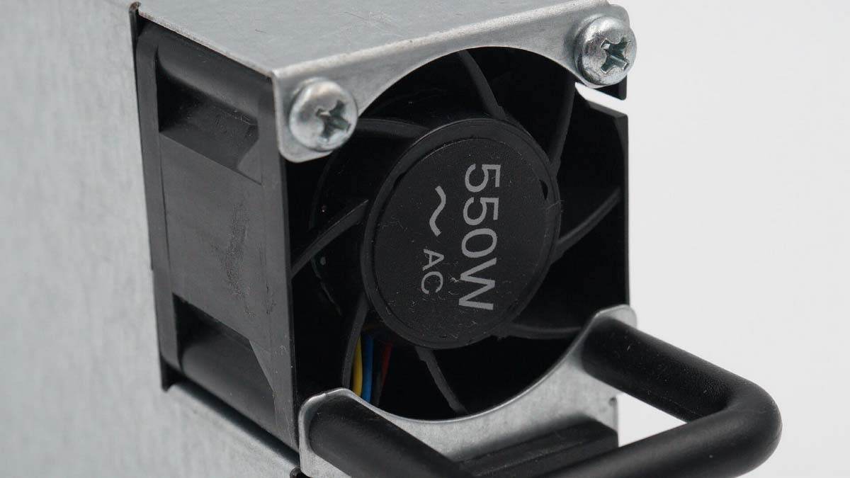 散熱風扇特寫,帶有擾流板,貼有電源功率標簽。