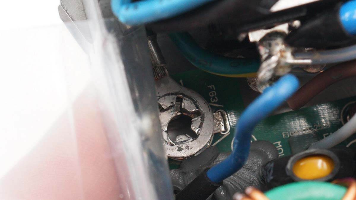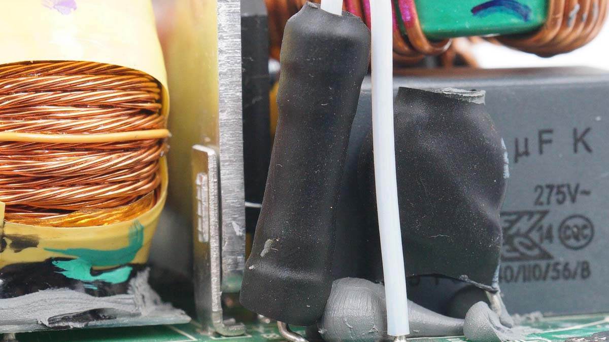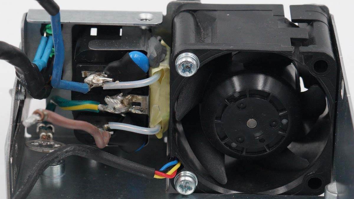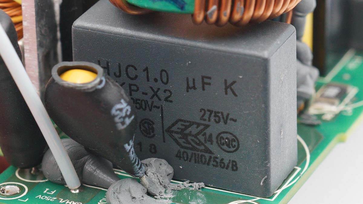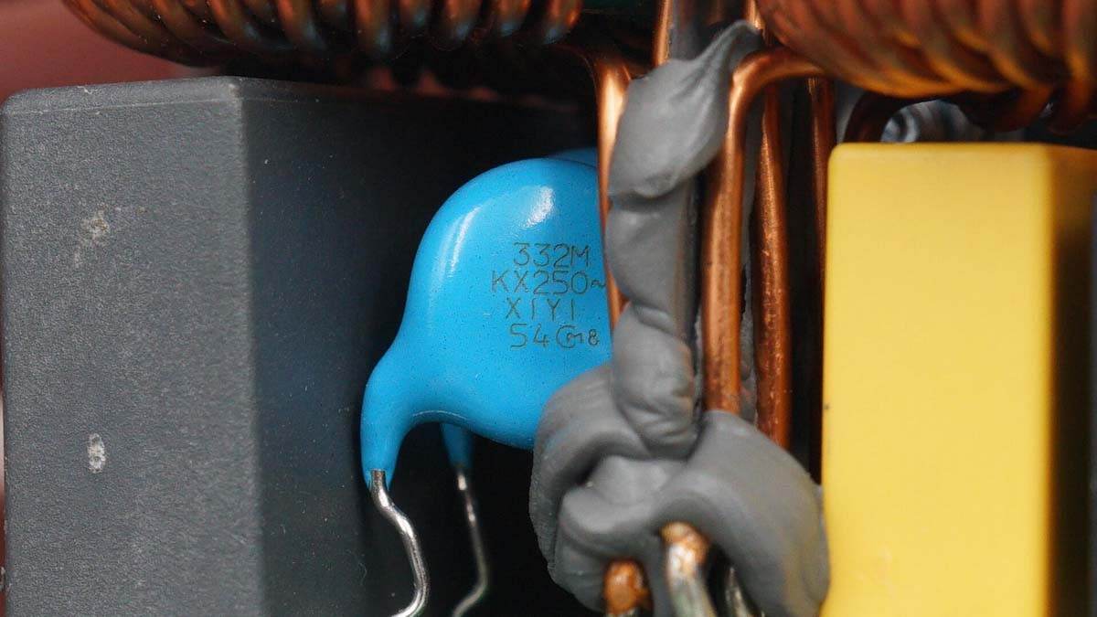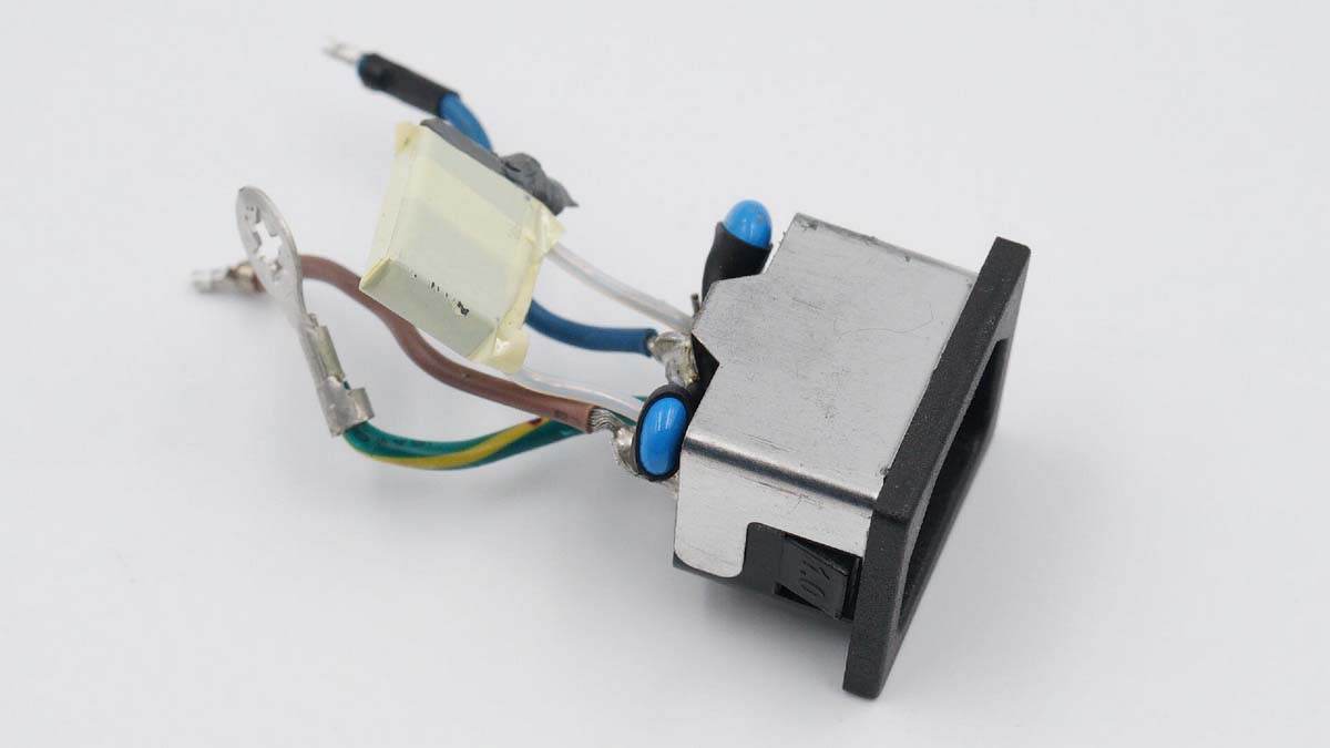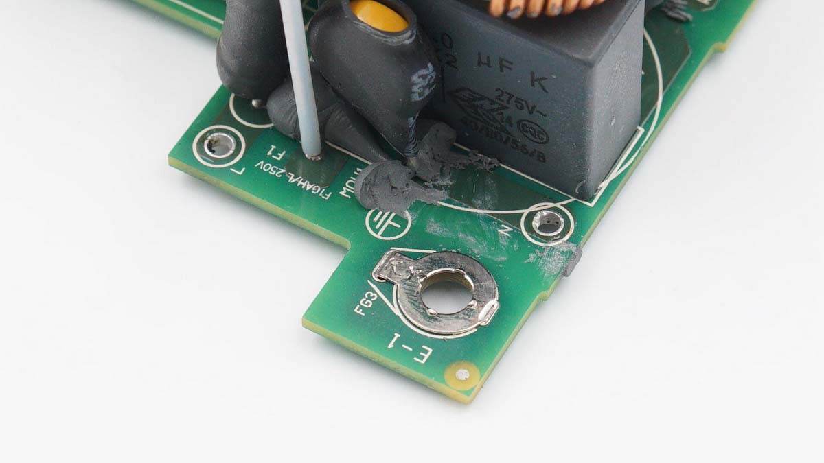 輸入母座與風扇間是一顆X電容,包裹絕緣膠帶。同時母座火線/零線和地線間均焊接有Y電容,Y電容外套絕緣管保護。