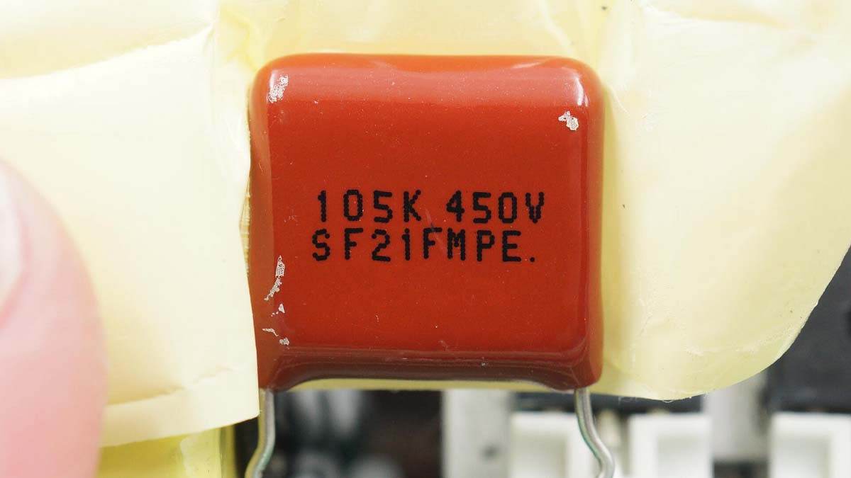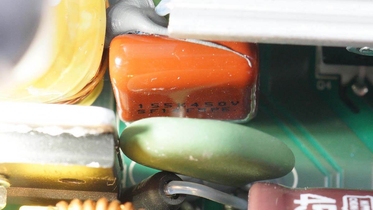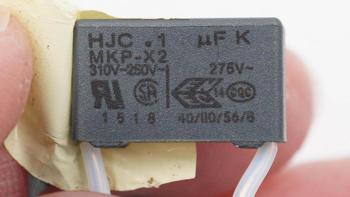膠帶包裹的器件是安規X電容,容量0.1μF。