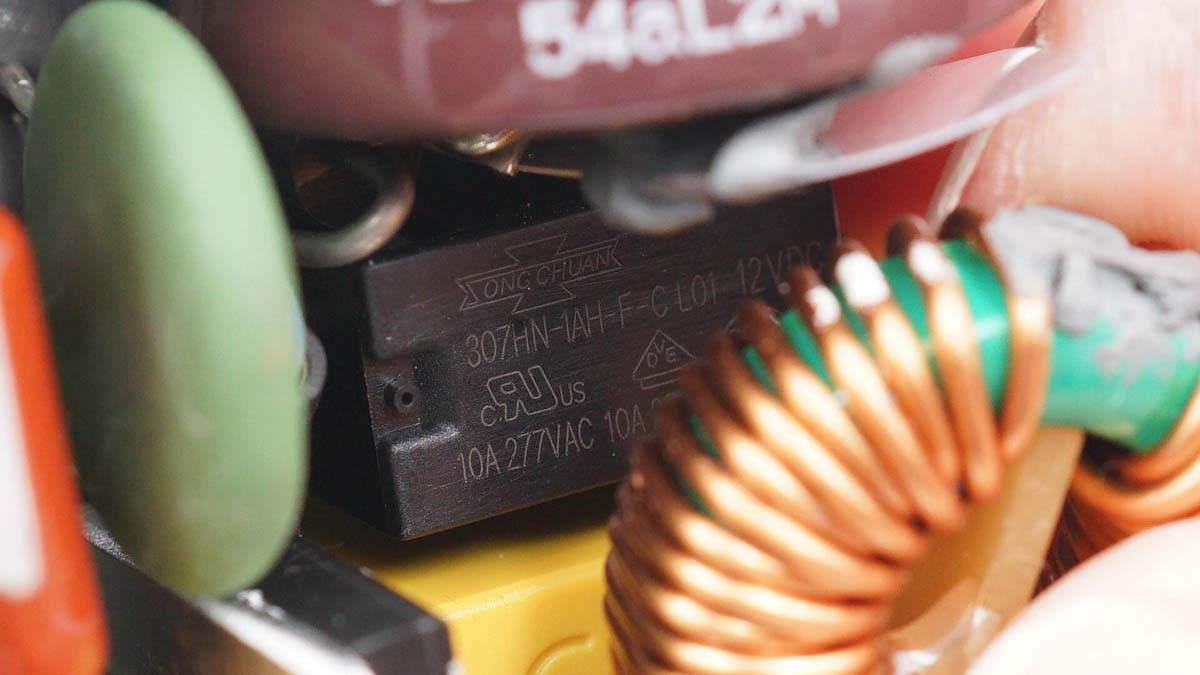 另一側還有Y電容、黃色安規電容以及一個繼電器。