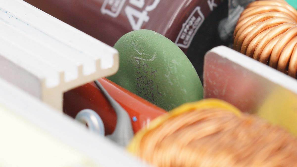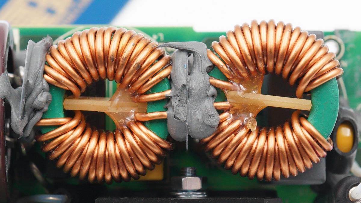 小板下有兩顆濾波電感,包裹絕緣膠帶。周邊是多顆濾波電容以及工字電感。
