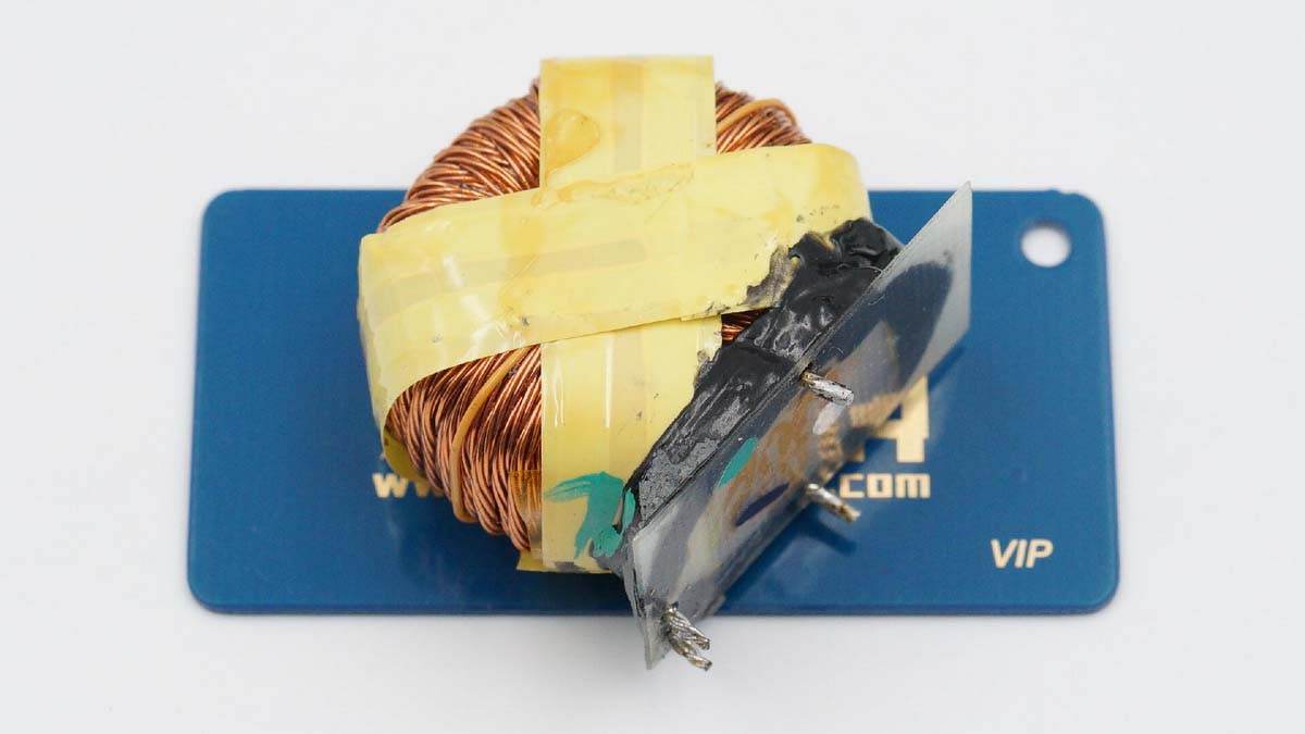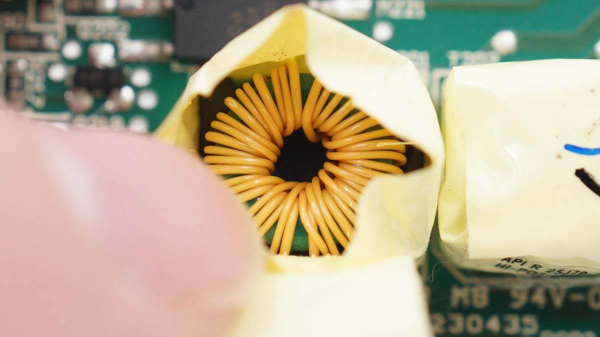 膠帶里邊是一顆磁環繞制的變壓器,采用多層絕緣線繞制。