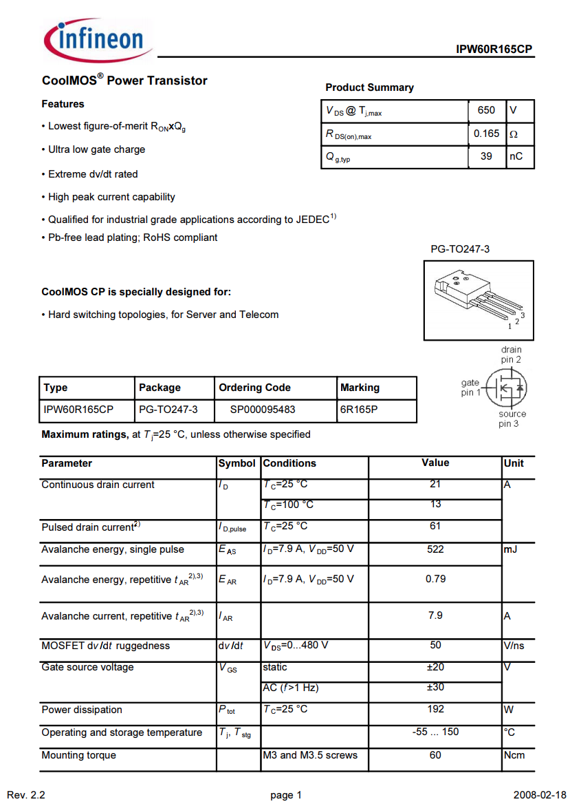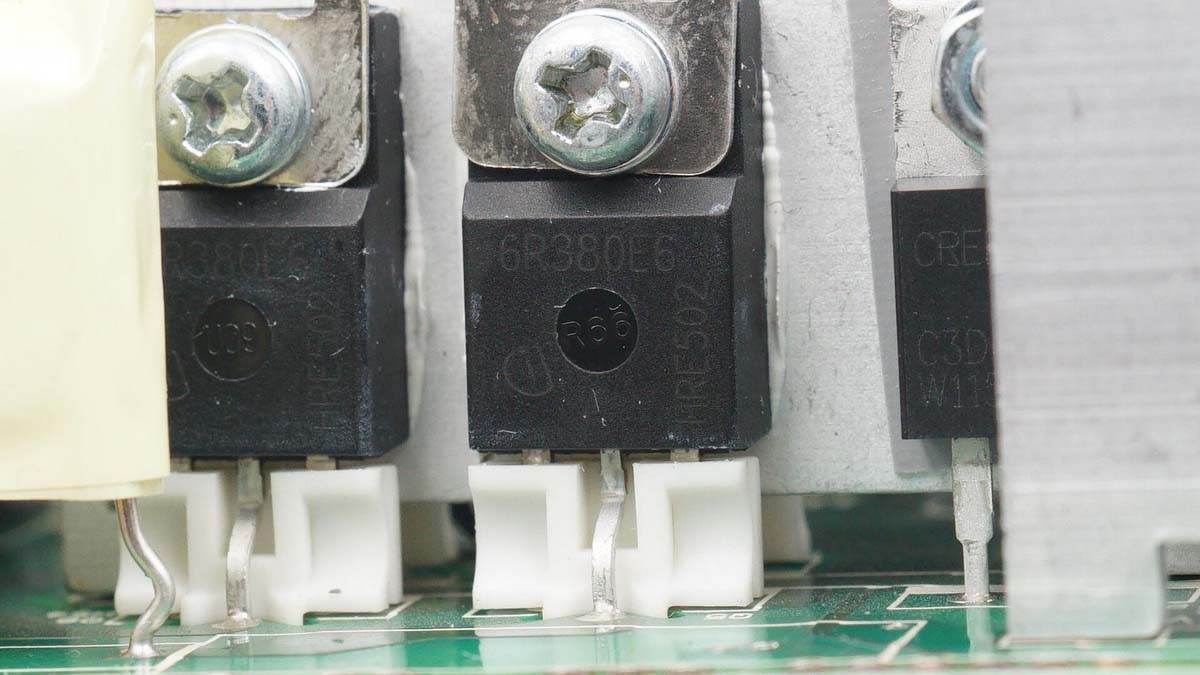 旁邊散熱片上固定有一顆PFC升壓管,之間還有導熱墊加強導熱效果。MOS管來自英飛凌,型號為IPW60R165CP,TO247封裝,耐壓650V,導阻165mΩ。