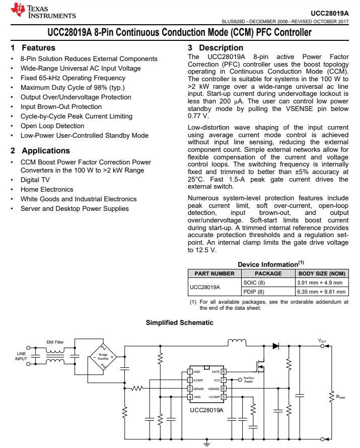 PFC升壓控制器采用TI德州儀器UCC28019A,升壓模式PFC控制器,支持連續導通模式,支持寬電壓輸入下100-2KW功率。