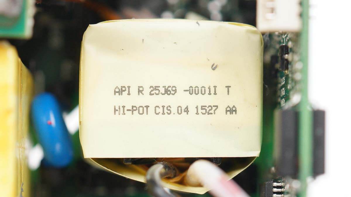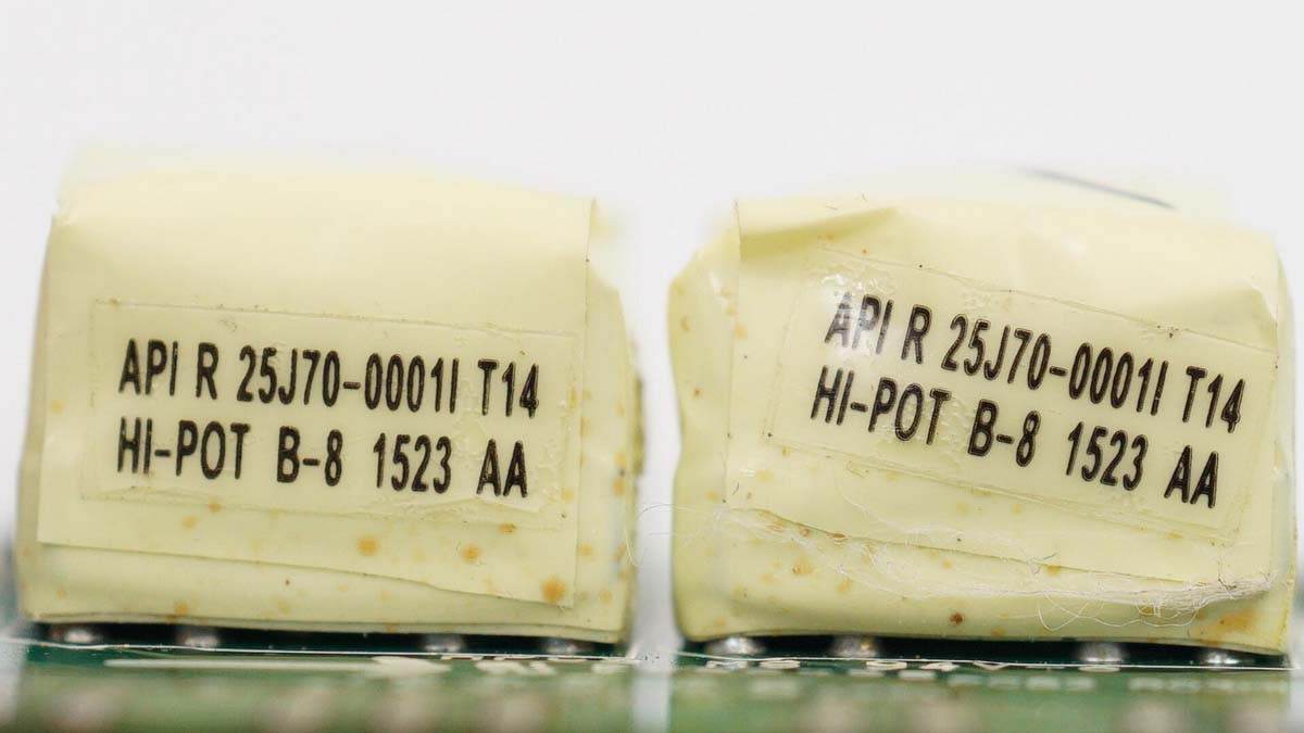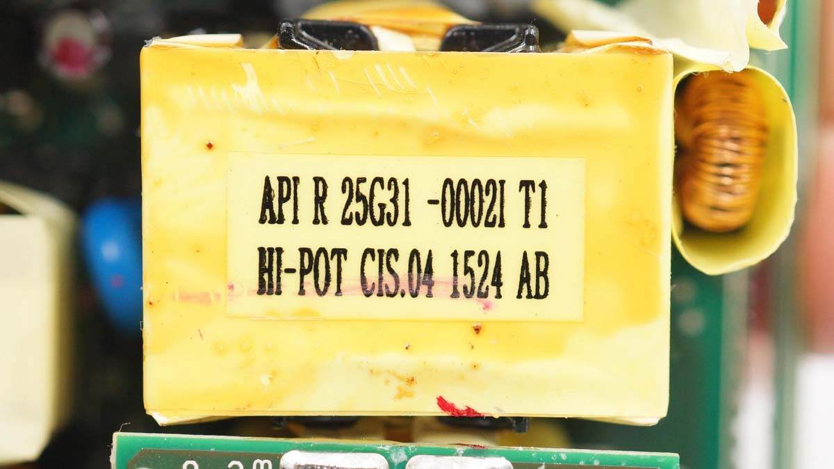 膠帶包裹的變壓器側邊貼有信息標簽。