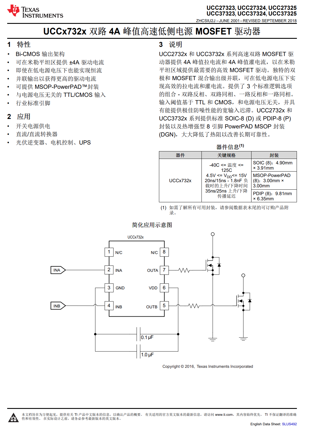 TI UCC27324,雙路高速低側MOS管驅動器,用于變壓器驅動。