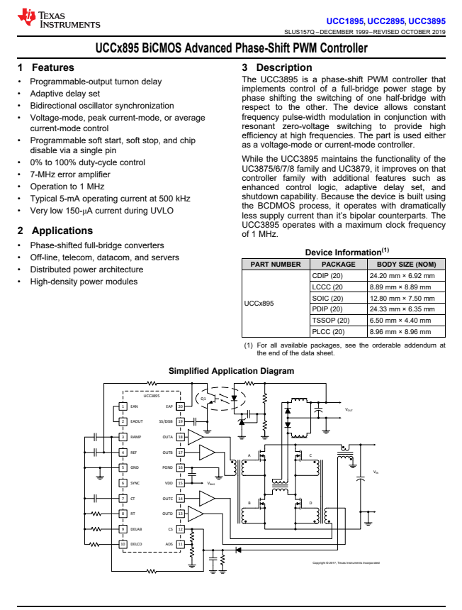 開關電源主控芯片采用TI UCC3895,是一顆移相全橋控制器,支持最高1MHz工作頻率,通過輸出信號到UCC27324來推動隔離變壓器驅動開關管。