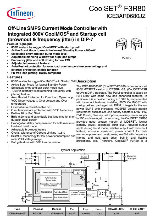 英飛凌ICE3AR0680JZ,離線開關電源芯片,內置耐壓800V開關管和高壓啟動電路,用于輔助電源供電。