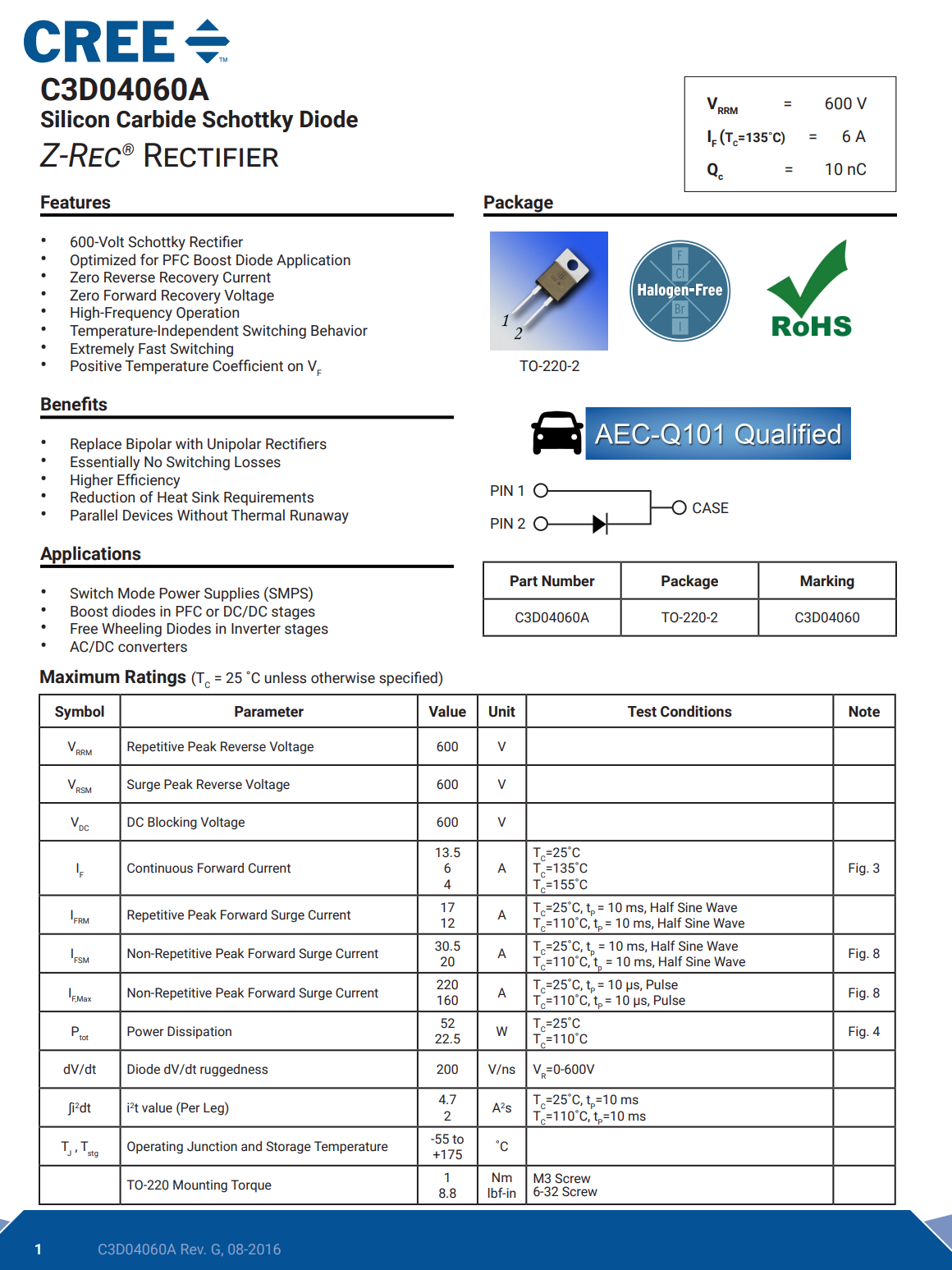 CREE C3D04060A,碳化硅二極管,耐壓600V,155℃下額定電流4A,用于PFC升壓整流。