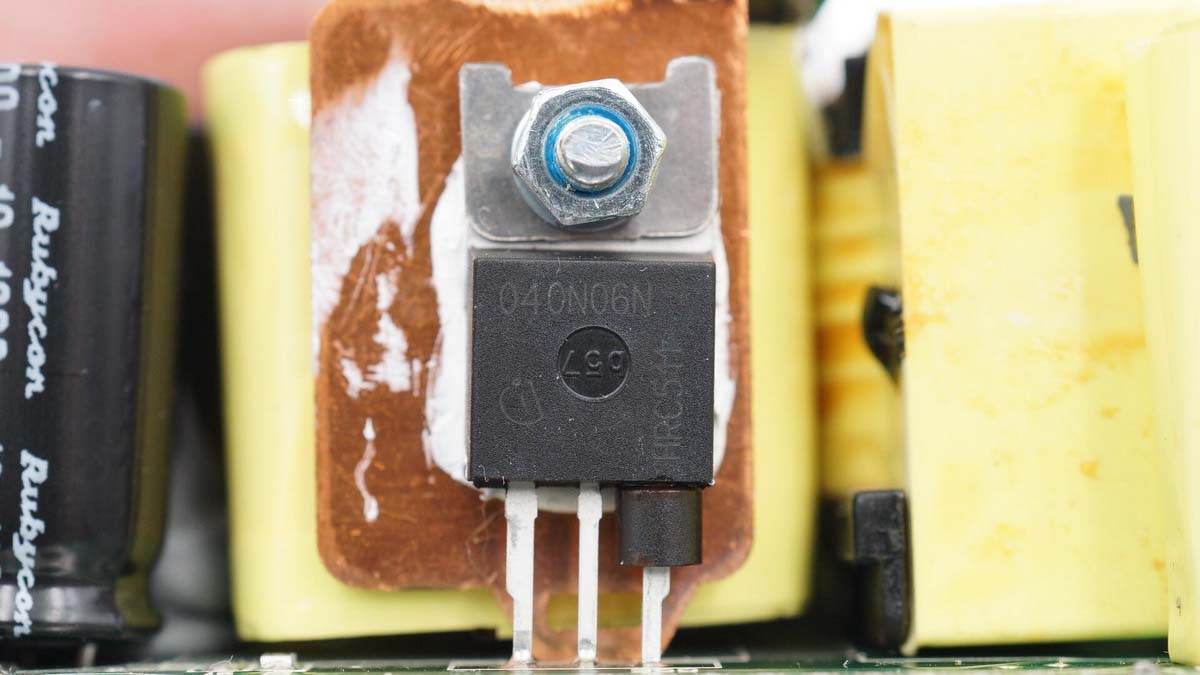 支撐金屬片上固定有同步整流管,采用英飛凌IPP040N06N3 G,耐壓60V,導阻4mΩ,通過螺絲固定到銅質散熱片上,并涂有導熱硅脂。