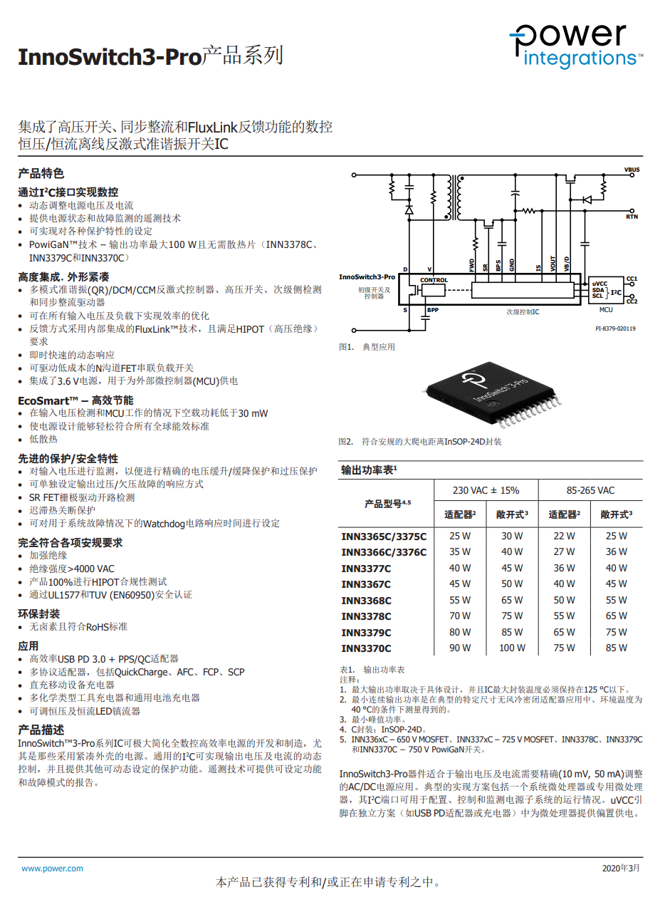 PI官方的資料顯示,INN3379C屬于InnoSwitch3-Pro家族,它采用了PI獨家的PowiGaN技術,也就是內置了GaN氮化鎵功率器件,相比傳統MOSFET可以輸出更大功率。
